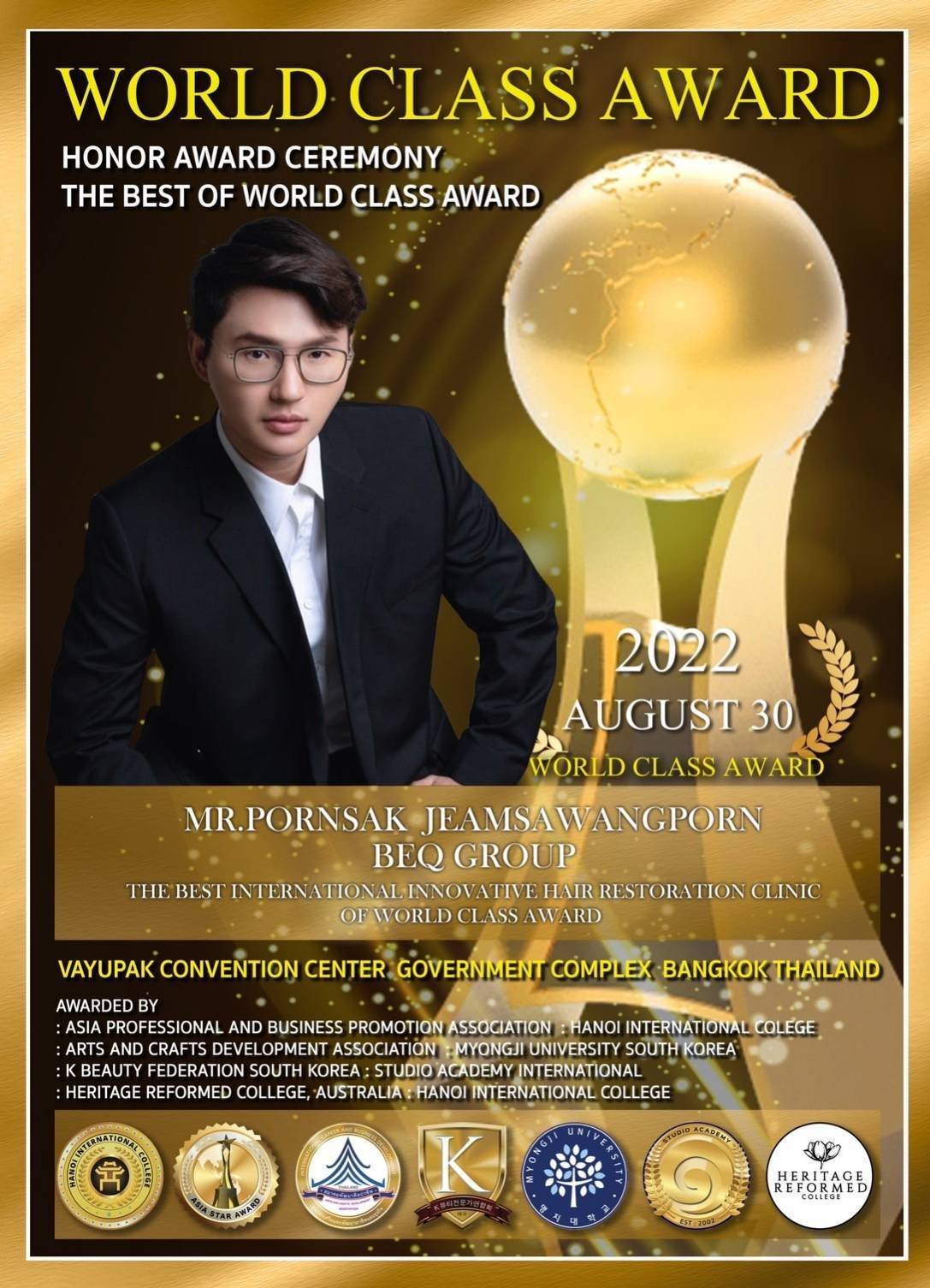 ถือเป็นอีกหนึ่งรางวัลใหญ่ระดับเชีย ที่การันตีความเป็นที่ 1 ของธุรกิจ การให้บริการปลูกผมครบวงจรที่สุดของประเทศไทย สำหรับ BEQ GROUP ผู้ประกอบธุรกิจปลูกผม ด้วยนวัตกรรมที่ทันสมัย และให้คำปรึกษาโดยแพทย์ผู้เชี่ยวชาญเฉพาะทาง ที่บริหารงานโดย นักธุรกิจหนุ่มไฟแรง คุณพรศักดิ์ เจียมสว่างพร และจากผลงาน และความสำเร็จของธุรกิจ ทำให้ล่าสุด BEQ GROUP ถูกคัดเลือกให้เข้ารับรางวัล "World Class Award 2022" จากสมาคมพัฒนาศิลปาชีพ และ สมาพันธ์ความงามประเทศเกาหลีใต้ ไปเมื่อวันที่ 30 ส.ค. ที่ผ่านมา ณ ศูนย์ประชุมวายุภักษ์ ศูนย์ราชการ ถนนแจ้งวัฒนะ กรุงเทพมหานคร