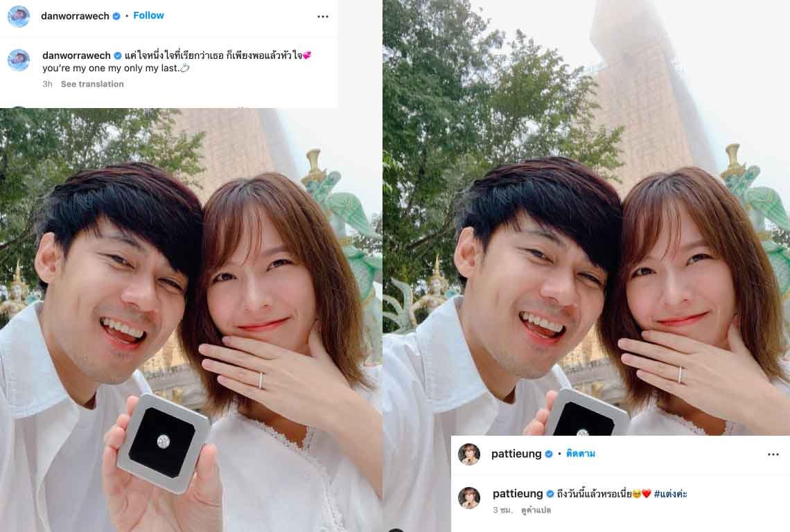 ถึงวันที่ทุกอย่างลง วันนี้ที่รอคอย สำหรับคู่รักคนดัง แดน วรเวช แพทตี้ อังศุมาลิน ออกมาประกาศข่าวดี หลังคบหากันมากว่า 10 ปี แดน วรเวช ได้โพสต์ภาพหวานฉ่ำ ลงในอินสตาแกรมส่วนตัว พร้อมแหวน ขอแต่งงาน กับแคปชั่นข้อความว่า "แค่ใจหนึ่งใจที่เรียกว่าเธอ ก็เพียงพอแล้วหัวใจ you’re my one my only my last." ส่วนแพทตี้ อังศุมาลิน ก็ได้โพสต์ภาพพร้อมแคปชั่น “ถึงวันนี้แล้วหรอเนี่ย#แต่งค่ะ” ทำเอาเพื่อน ๆ ร่วมวงการต่างเข้ามาแสดงความยินดีกันมากมาย