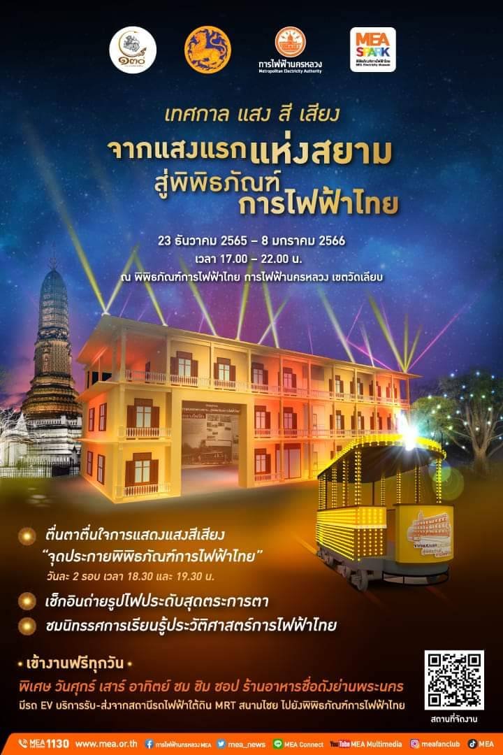 ผู้ว่าการ MEA กล่าวถึงการจัดเทศกาล แสง สี เสียง “จากแสงแรกแห่งสยาม สู่พิพิธภัณฑ์การไฟฟ้าไทย” ในครั้งนี้ว่า จะเป็นการจัดแสดงประวัติศาสตร์ตั้งแต่ยุคแรกของการกำเนิดแสงแรกแห่งสยาม ยุคของการกำเนิด การไฟฟ้าในไทย ยุคประวัติศาสตร์ของอาณาจักรโรงไฟฟ้าวัดเลียบ ไปจนถึงยุคกำเนิดพิพิธภัณฑ์การไฟฟ้าไทย จำลองอาคารพิพิธภัณฑ์การไฟฟ้าไทย อาคารที่ผ่านประวัติศาสตร์เป็นเวลา 106 ปี โดย ภายในงานจะได้พบกับกิจกรรมสร้างความเพลิดเพลิน และความประทับใจส่งท้ายปี ได้แก่ การแสดงแสง สี เสียง “จุดประกายพิพิธภัณฑ์การไฟฟ้าไทย” ที่สร้างสรรค์โชว์ด้วยสื่อมัลติมีเดียผสมผสาน พร้อมแสงไฟเคลื่อนไหวไปกับท่วงทำนองของบทเพลง ซึ่งมีให้ชมทุกวัน วันละ 2 รอบ เวลา 18.30 น. และ 19.30 น. ท่ามกลางการตกแต่งสถานที่และประดับไฟโดยรอบอย่างตระการตา โดยร่วมกับ กรุงเทพมหานคร ได้แก่ อาคารที่ทำการ การไฟฟ้านครหลวง เขตวัดเลียบ พระพุทธปรางค์ วัดราชบุรณราชวรวิหาร (วัดเลียบ) และสวนสาธารณะหน้าอาคาร ตลอดจนโซนร้านอาหารชื่อดังย่านพระนคร ที่จะมาร่วมออกร้านภายในงานในครั้งนี้ด้วย ซึ่งถือเป็นการส่งมอบความสุขให้แก่ประชาชนในช่วงเทศกาลส่งท้ายปีเก่า ต้อนรับปีใหม่ รวมทั้งยังเป็นการสร้างรายได้ และกระตุ้นเศรษฐกิจจากการท่องเที่ยวให้กับประเทศ