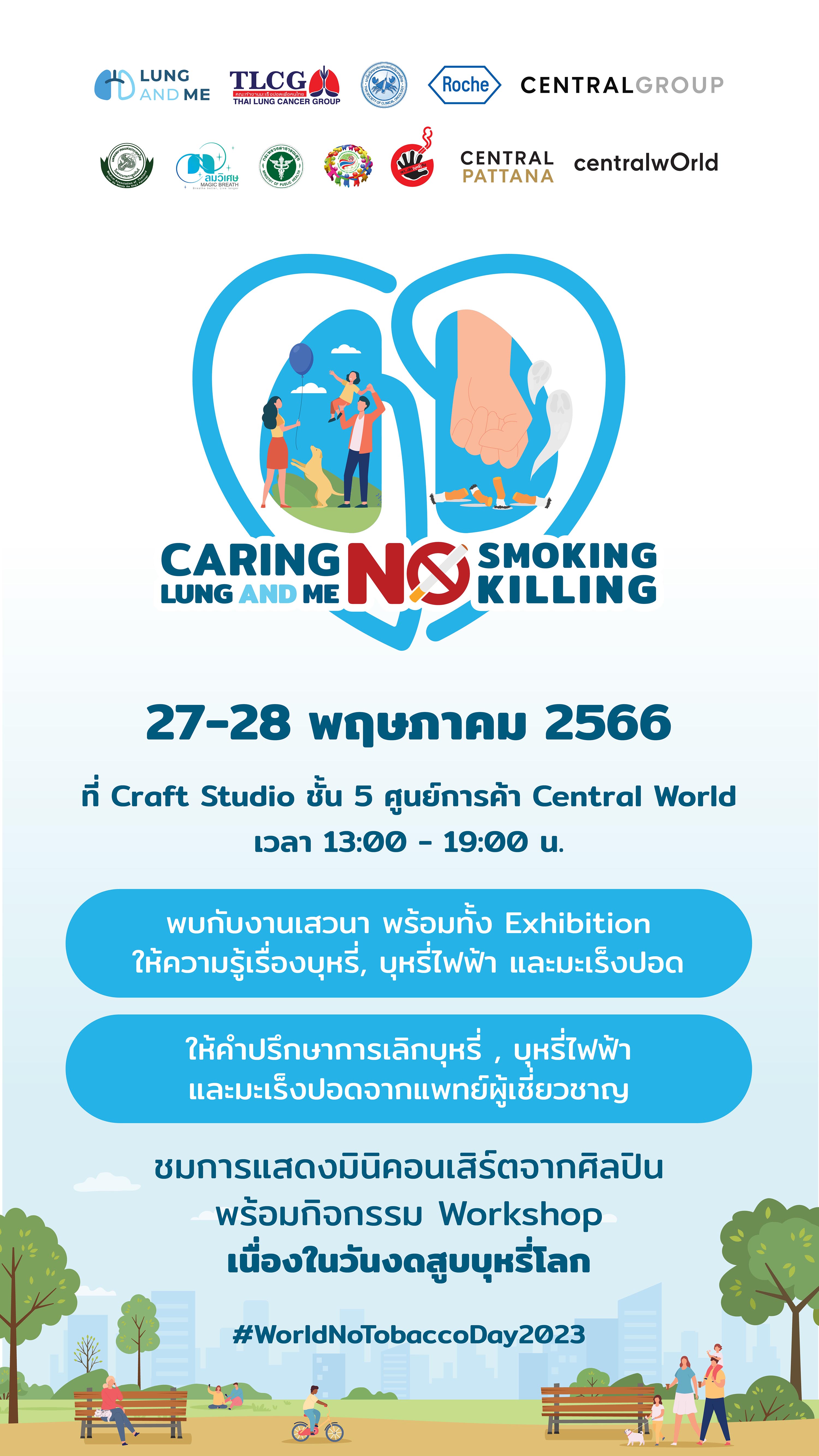 เนื่องใน “วันงดสูบบุหรี่โลก” ซึ่งตรงกับวันที่ 31 พฤษภาคมของทุกปี คณะทำงานมะเร็งปอดเพื่อคนไทย ภายใต้ มะเร็งวิทยาสมาคมแห่งประเทศไทย ร่วมกับ Lung And Me Digital Solution สำหรับผู้ป่วยมะเร็งปอด และ บริษัท กลุ่มเซ็นทรัล จำกัด ได้จัดกิจกรรมรณรงค์วันงดสูบบุหรี่โลก ในงาน Caring Lung and me No Smoking No Killing ชวนรับฟังเสวนาในหัวข้อ “บุหรี่กับสังคมไทย และโอกาสเสี่ยงมะเร็งปอด” โดย ชัชชาติ สิทธิพันธุ์ ผู้ว่าราชการกรุงเทพมหานคร, รศ.นพ. ฉันชาย สิทธิพันธุ์ คณบดีคณะแพทยศาสตร์ จุฬาลงกรณ์มหาวิทยาลัย และ รศ.นพ.ดร. วิโรจน์ ศรีอุฬารพงศ์ประธานคณะทำงานมะเร็งปอดเพื่อคนไทยเพื่อสร้างความตระหนักรู้ถึงพิษภัยของบุหรี่พร้อมแนะวิธีป้องกันและการดูแลสุขภาพปอดจากแพทย์ผู้เชี่ยวชาญมะเร็งปอดสามารถรักษาให้หายได้หากตรวจพบเร็ว
