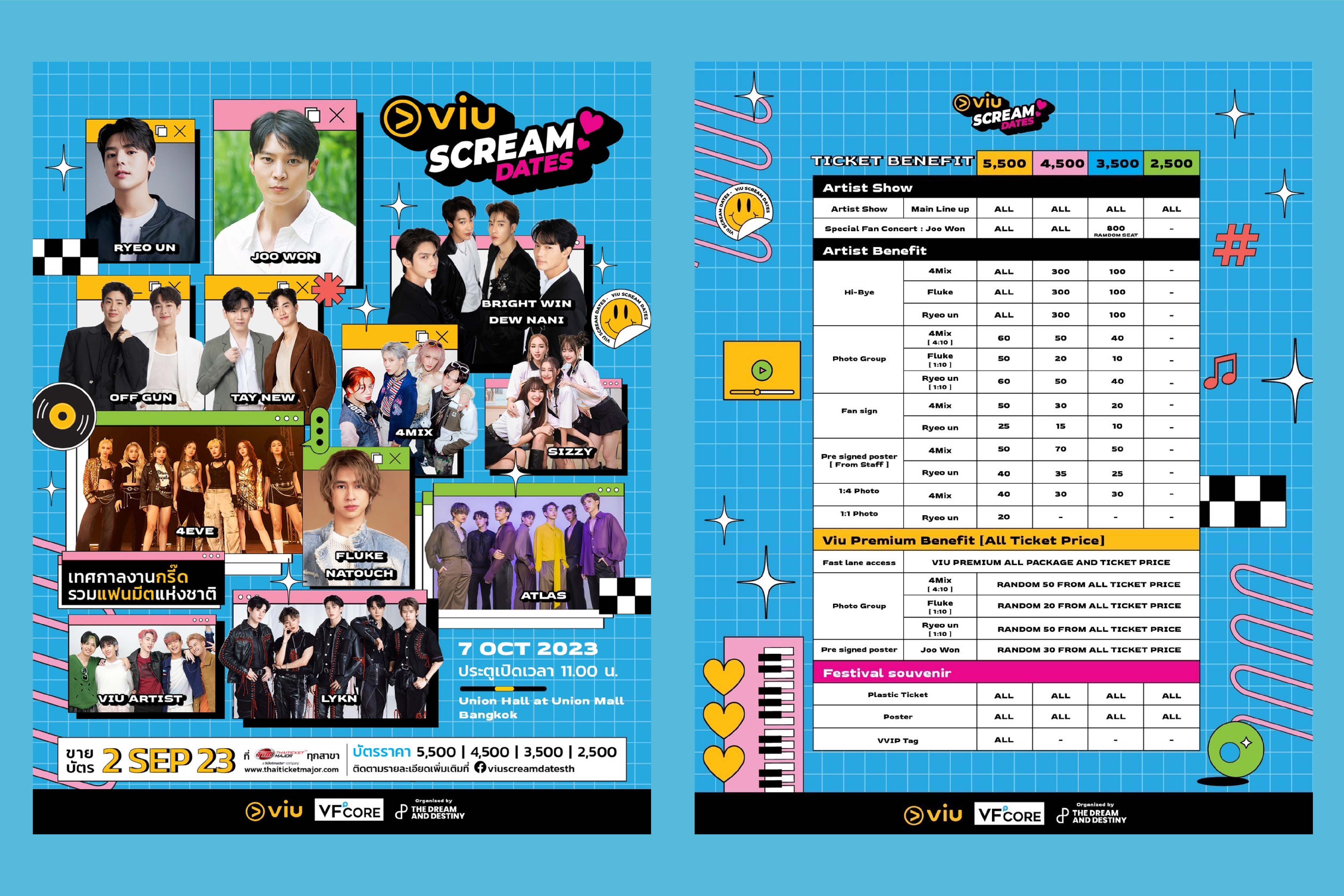 ไฮไลท์ของงาน "Viu Scream Dates 2023" คือการรวมตัวกันของศิลปินชื่อดังที่จะมาพร้อมโชว์สุดพิเศษที่ไม่เคยแสดงที่ไหนมาก่อน คอนเสิร์ต และกิจกรรมสุดเอ็กซ์คลูซีฟมากมายจากเหล่าคนดัง นำทัพโดย 2 นักแสดงเกาหลี จูวอน (Joo Won) นักแสดงหนุ่มมากความสามารถ เจ้าของผลงานภาพยนต์และชีรีส์มากมาย อาทิ Stealer: The Treasure Keeper และ รยออุน (Ryeo Un) นักแสดงหนุ่มดาวรุ่งหุ่นแซ่บ จากชีรีส์ 18 Again, The Secret Romantic Guesthouse เสริมทัพด้วยซูเปอร์สตาร์ไทยจากบ้าน GMMTV ได้แก่ ไบรท์-ชิรวิชญ์, วิน-เมธวิน, นานิ-หิรัญกฤษฏิ์, ว-รวรรตน์ 4 นักแสดงนำจากชีรีส์ F4 Thailand: หัวใจรักสี่ดวงดาว BOYS OVER FLOWERS พร้อมด้วย 2 คู่จิ้นอย่าง ออฟ-จุมพล, กัน-อรรถพันธ์ และ เต-ตะวัน, นิว-ฐิติภูมิ รวมถึงนักแสดงหนุ่มหน้าหวานมากความสามารถอย่าง ฟลุ้ค-ณธัช จากชีรีส์เรื่องใหมในปีนี้ Shadow เงา/ล่า/ตาย และเหล่านักแสดง Viu Artist จากชีรีส์เรื่องใหม่ Close Friend โคตรแฟน ซีซัน 3 ต่อขบวนความปังด้วยศิลปิน T-POP ที่ขนไอดอลเจนใหม่มากันทั้ง เกิร์ลกรุ๊ป และ บอยแบนด์ อาทิ 4EVE,ATLAS, SIZZY, 4MIX, LYKN เป็นต้น