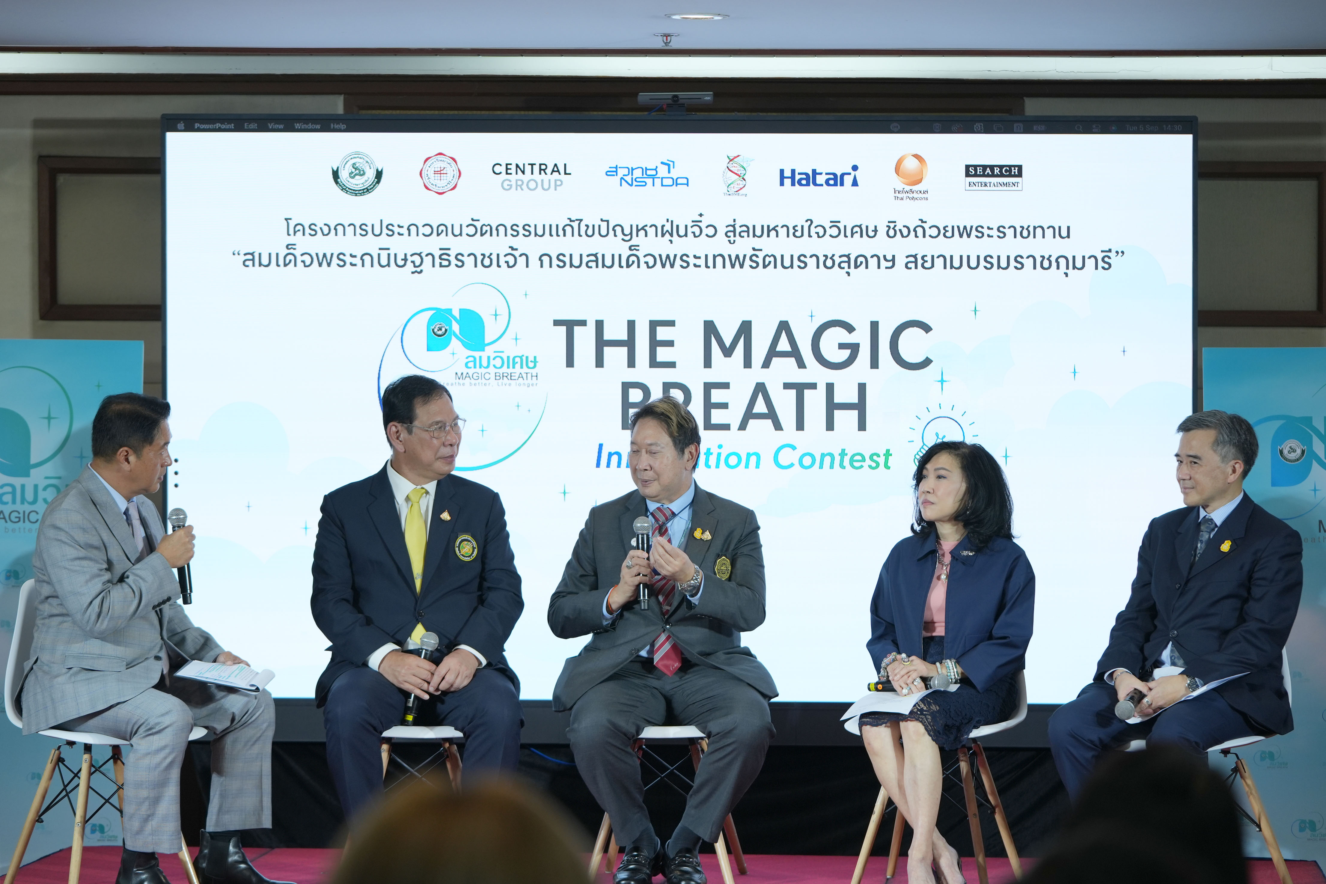 งานแถลงข่าวครั้งนี้ นำโดย สุพัตรา จิราธิวัฒน์ ในฐานะประธานชมรมลมวิเศษ และ รองกรรมการผู้จัดการใหญ่ ฝ่ายองค์กรสัมพันธ์และภาพลักษณ์ กลุ่มเซ็นทรัล, รศ.นพ.สุทัศน์ รุ่งเรืองหิรัญญา ประธานที่ปรึกษาชมรมลมวิเศษ, รศ.ดร. สมชาย สันติวัฒนกุล อธิการบดีมหาวิทยาลัยศรีนครินทรวิโรฒ, วิทยา พานิชตระกูล กรรมการผู้จัดการ บริษัท ฮาตาริ อิเล็คทริค จำกัด และ ดร. พรอนงค์ พงษ์ไพบูลย์ หัวหน้ากลุ่มงานวิจัย สวทช. ร่วมแถลงรายละเอียดโครงการประกวดนวัตกรรมแก้ไขปัญหาฝุ่นจิ๋ว พร้อมเปิดประเด็น “ความสำคัญของปัญหา PM2.5” โดย นพ.สุขุม กาญจนพิมาย นายกแพทยสมาคมฯ