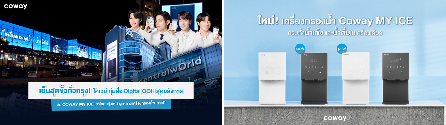 ทุ่มครั้งใหญ่ส่งท้ายปี! COWAY (โคเวย์) แบรนด์เครื่องกรองน้ำและเครื่องฟอกอากาศอันดับ 1 จากเกาหลีใต้ สร้างปรากฏการณ์ปูพรมสื่อ Digital Out Of Home ทั่วกรุง ชูผลิตภัณฑ์ “COWAY MY ICE” นวัตกรรมเครื่องกรองน้ำรุ่นใหม่ ที่มีฟังก์ชันทำน้ำแข็งจากน้ำดื่ม RO เป็นรุ่นแรกในไทย ตอกย้ำความปังด้วยการดึง 4 หนุ่มบอยแบนด์วง BTS อวดโฉมบนหน้าจอดิจิทัลขนาดยักษ์ แบบเต็มตา ทั้งบริเวณศูนย์การค้าสยามพารากอนและห้างเซ็นทรัลเวิลด์ รวมถึงติดตั้งป้าย LED Billboard ขนาดเล็กในรูปแบบ Billboard Cookie ตามท้องถนนและบริเวณเสารถไฟฟ้า เรียกเสียงกรี๊ดจากเหล่าแฟนคลั บทุกเพศทุกวัย พร้อมมอบบรรยากาศเย็นฉ่ำ กระจายไปทั่วเมือง! บริษัทฯ มั่นใจเทคโนโลยีสื่อยุคใหม่ช่วยดัน COWAY MY ICE สามารถเข้าถึงผู้บริโภคทุกเพศทุกวัยและเจาะกลุ่มคนเจนใหม่ได้ อย่างมีประสิทธิภาพมากขึ้น ซึ่งจะช่วยกระตุ้นยอดขายไตรมาสสุดท้าย และเพิ่มยอดรวมของปี 2566 ได้อย่างแน่นอน