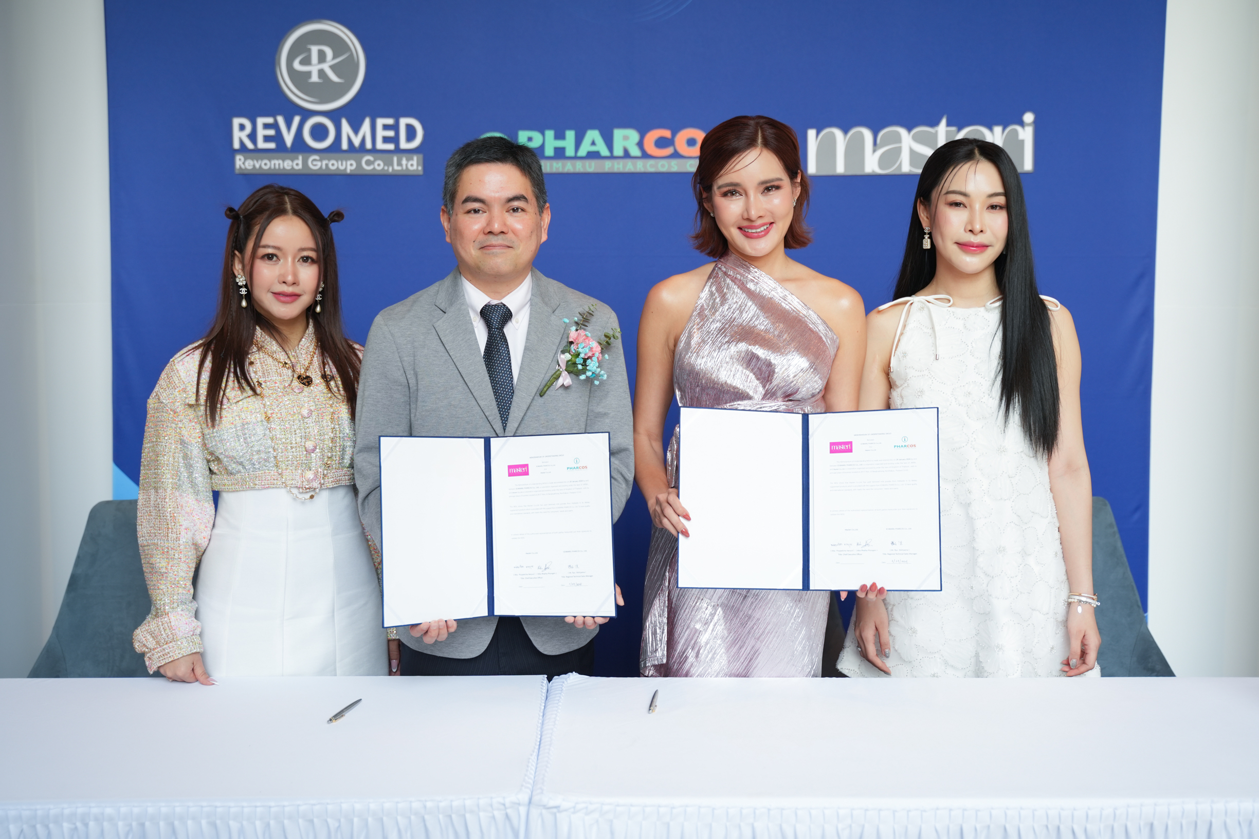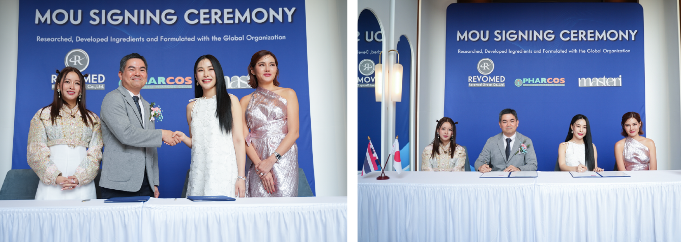 เมื่อวันที่ 29 มกราคม 2567 ที่ผ่านมา ได้มีพิธีลงนามเซ็นบันทึกข้อตกลง (MOU) โดยความร่วมมือ สัญญาตัวแทนระหว่าง “คุณรฐา โพธิ์งาม” นักร้องนักแสดง ชื่อดัง และ “คุณพลอยพัชชา หาญยุทธ” แม่ค้าออนไลน์ ชื่อดัง สายแฟชั่น ที่ล่าสุด ทางแบรนด์ MASTERI ได้ลงนามเซ็นสัญญาบันทึกข้อตกลง (MOU) โดยมี คุณวาสนา อินทะแสง หรือคุณเมย์ CEO, REVOMED (Thailand) โรงงานให้บริการแบบครบวงจร สำหรับผู้ที่อยากผลิตครีม เครื่องสำอาง สินค้าเพื่อสุขภาพและความงาม และอาหารเสริมทุกรูปแบบ ภายใต้แบรนด์ของลูกค้าเอง สามารถรับผลิตได้ทั้งในและต่างประเทศ จับมือ กับ Mr. Ryo Nishiyama Regional Technical Sales Manager (มิสเตอร์ เรียว นิชิยามะผู้จัดการฝ่ายขายด้านเทคนิคประจำภูมิภาค) ประเทศญี่ปุ่น Ichimaru Pharcos เป็นบริษัทผู้นำด้านการค้นคว้าวิจัย และผู้ผลิต active ingredients (สารที่ใช้ในส่วนผสม ทำให้ออกฤทธิ์เห็นผลลัพธ์)