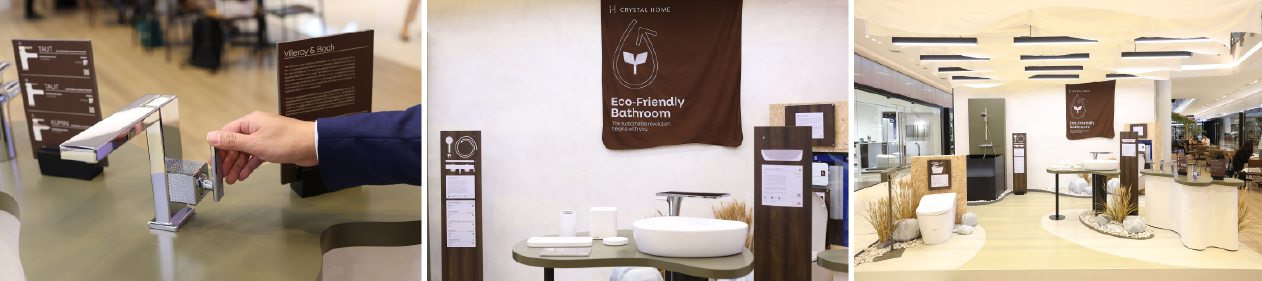 ในพื้นที่ของ Crystal Home จึงมีการนำเสนอผลิตภัณฑ์ที่ส่งเสริมทั้งความหรูหราและความยั่งยืนไว้อย่างหลากหลาย ซึ่งเมื่อรวมกับแนวทางของ Crystal Home ที่ต้องการให้การแต่งบ้านเป็นเรื่อง ‘ง่ายและคุ้มค่า’ ด้วยแล้ว ทำให้การออกแบบห้องน้ำของ Crystal Home ถูกสะท้อนออกมาภายใต้แบรนด์สุขภัณฑ์ระดับไฮเอนด์ ที่มีทั้งรูปลักษณ์ทันสมัย และฟังก์ชันการใช้งานที่เป็นมิตรต่อทั้งผู้ใช้และสิ่งแวดล้อม รวมถึงราคาที่เหมาะสมและเข้าถึงได้สำหรับทุกกลุ่มลูกค้า