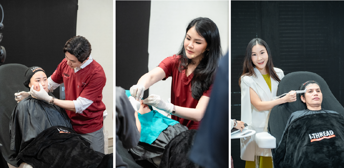 i-THREAD Master Class ยังได้รับเกียรติจากอาจารย์ของโรงพยาบาลศิริราช อีก 2 ท่าน อันได้แก่ “ผศ.พญ.ธัญญา เตชะพิเชฐวนิช” ซึ่งได้ส่งวีดีโอ Topic เรื่อง Modified i-THREAD มาให้ชมหัตถการการใช้ i-THREAD ว่ามีวิธีการทำอย่างไร และ “อ.ญาณิน นกเทศ” หนึ่งในผู้วิจัยทำหัตถการไหม i-THREAD จากโรงพยาบาลศิริราช มาร่วมบรรยายถึงแนวทางการทำงานวิจัย การเลือกไหม การเลือกผลิตภัณฑ์ และการเลือกเคสที่มาทำ รวมทั้งผลลัพธ์ในการทำวิจัยไหม i-THREAD พบว่าคนไข้ทุกรายได้ผลลัพธ์ที่น่าพอใจ โดยติดตามผลตั้งแต่เดือนแรกจนถึง 6 เดือน ในไทย ภายในงานคุณหมอไทยจะได้เทคนิคใหม่ๆ ในการเติมเต็มหน้าผากโดยการใช้ไหม i-THREAD แทนการใช้ฟิลเลอร์ เพราะการใช้ฟิลเลอร์ หากคุณหมอไม่เชี่ยวชาญพอ หรือเกิดข้อผิดพลาดอาจส่งผลต่อความปลอดภัยของคนไข้ได้ ดังนั้น “นพ.วชิระ คุณาธาทร” (คุณหมอฟรุ๊ท) จึงรับหน้าที่ในการทำหัตถการเติมเต็มหน้าผาก ว่ามีวิธีการเลือกเคสแบบไหน และโชว์เทคนิคในการใช้ไหม Volume และไหม Martix มาใช้ในการเติมเต็มร่องหน้าผาก