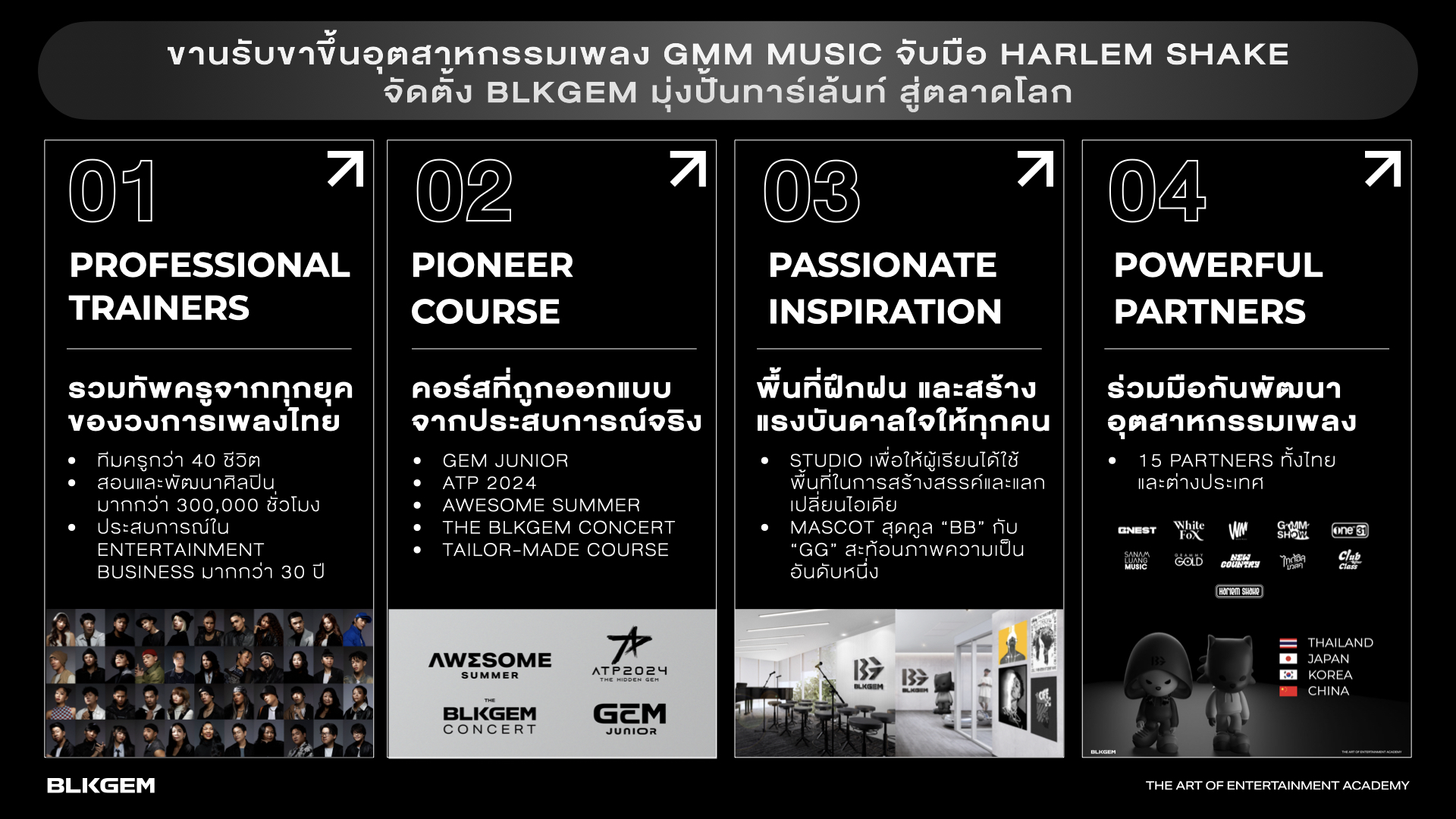 ล่าสุดได้มีการจับมือ “บริษัท ฮาร์เล็มเชค จำกัด ” (HARLEM SHAKE) สถาบันพัฒนาศิลปินชั้นนำของประเทศ จัดตั้ง “BLKGEM” (แบล็คเจ็ม) สถาบันศิลปะบันเทิงภายใต้คอนเซ็ปต์ The Art of Entertainment Academy โดยมีการร่วมกันพัฒนาหลักสูตรกับพาร์ทเนอร์ระดับ Global เพื่อเพิ่มมูลค่าตลาด (unlock value) ของธุรกิจเพลงไทยในการขยายตลาดทั้งภายในประเทศและต่างประเทศ รวมถึงการพัฒนาคุณภาพของบุคลากรทั้งเบื้องหน้าและเบื้องหลัง เพื่อเพิ่มศักยภาพ (uplift quality) ของอุตสาหกรรมบันเทิงทั้งไทยและต่างประเทศที่กำลังเติบโตเข้าสู่ New Music Economy โดยในงานแถลงข่าวเปิดตัว เมื่อวันที่ 25 เมษายนที่ผ่านมา คุณฟ้าใหม่ ดำรงชัยธรรม ประธานเจ้าหน้าที่ฝ่ายการตลาด GMM MUSIC ได้กล่าวถึงความร่วมมือในครั้งนี้ว่า“ ในขณะนี้ธุรกิจเพลงทั่วโลกและประเทศไทยกำลังอยู่ในช่วงขาขึ้นเติบโตเข้าสู่ ยุค new music economy เป็น second wave ที่มาจากการเฟื่องฟูของ สตรีมมิงแพลตฟอร์ม, การเติบโตของศิลปิน
