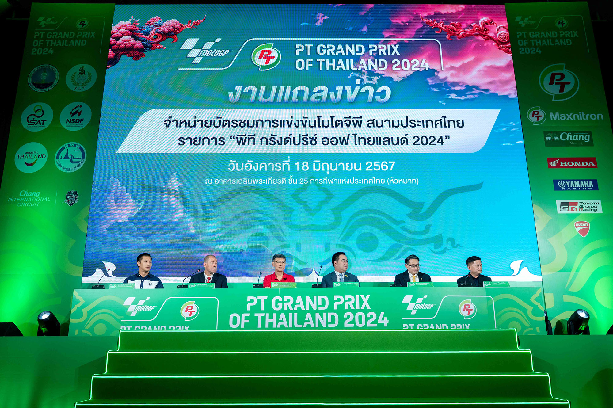 กระทรวงการท่องเที่ยวและกีฬา จัดแถลงข่าวการจัดการแข่งขันและเปิดจำหน่ายบัตร ศึกรถจักรยานยนต์ทางเรียบชิงแชมป์โลก หรือ MotoGP ที่ประเทศไทยเป็นเจ้าภาพ สนามที่ 18 พร้อมเปิดตัวไตเติ้ล สปอนเซอร์ใหม่ บริษัท พีทีจี เอ็นเนอยี จำกัด (มหาชน) หรือ PTG รู้จักกันดีในฐานะเจ้าของสถานีบริการน้ำมัน PT, ผลิตภัณฑ์น้ำมันหล่อลื่นเครื่องยนต์ PT Maxnitron และยังมีธุรกิจอื่นในเครือ เช่น แบรนด์ร้านกาแฟ พันธุ์ไทย, คอฟฟี่เวิล์ด รวมถึงศูนย์บริการรถยนต์ Autobacs ภายใต้ชื่อรายการ “PT Grand Prix of Thailand 2024” เตรียมสร้างปรากฏการณ์ใหม่ระดับเวิลด์คลาส นำเสนออัตลักษณ์ความงดงามแบบไทย พร้อมเสิร์ฟประสบการณ์มอเตอร์สปอร์ต เฟสติวัล เต็มรูปแบบที่หาที่ไหนไม่ได้ โดยจะชิงชัยที่ สนามช้าง อินเตอร์เนชั่นแนล เซอร์กิต จ.บุรีรัมย์ ระหว่าง 25-27 ตุลาคม 2567 ถ่ายทอดความยิ่งใหญ่ไปกว่า 200 ประเทศทั่วโลก สู่ผู้ชม 800 ล้านคน โดยหลังเปิดจำหน่ายบัตรแกรนด์ สแตนด์ Sold Out ด้วยเวลา 03.12 นาที