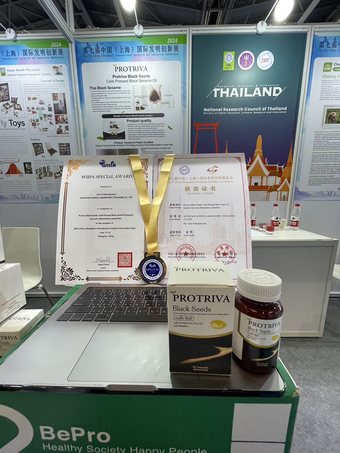โดยหลังจากที่ สำนักงานการวิจัยแห่งชาติ (วช.) กระทรวงการอุดมศึกษา วิทยาศาสตร์ วิจัยและนวัตกรรม พร้อมด้วยนักประดิษฐ์นักวิจัยไทยนับร้อย ได้นำผลงานวิจัย สิ่งประดิษฐ์ นวัตกรรมของนักวิจัย และนักประดิษฐ์เพื่อเป็นตัวแทนของประเทศไทยเข้าร่วมประกวด และจัดแสดงในเวทีระดับนานาชาติ ที่งาน “The 7th China (Shanghai) International Invention & Innovation Expo 2024” ณ นครเซี่ยงไฮ้ สาธารณรัฐประชาชนจีน นายสถาพร ปานศักดิ์ และ นายอนัส ประทีปสุวรรณ กรรมการผู้จัดการบริษัทนิวทริชั่น ไซเอนซ์ แลบบอราทอรี่ (ประเทศไทย) จํากัด เจ้าของแบรนด์โปรทริว่า (PROTRIVA) ผู้นำธุรกิจผลิตภัณฑ์เสริมอาหารชนิดซอฟท์เจล ได้นำผลิตภัณฑ์เสริมอาหารของไทยอย่างน้ำมันงาดำสกัดเย็นโปรทริว่า แบล็คซีดส์เข้าร่วมการประกวดในครั้งนี้ด้วย