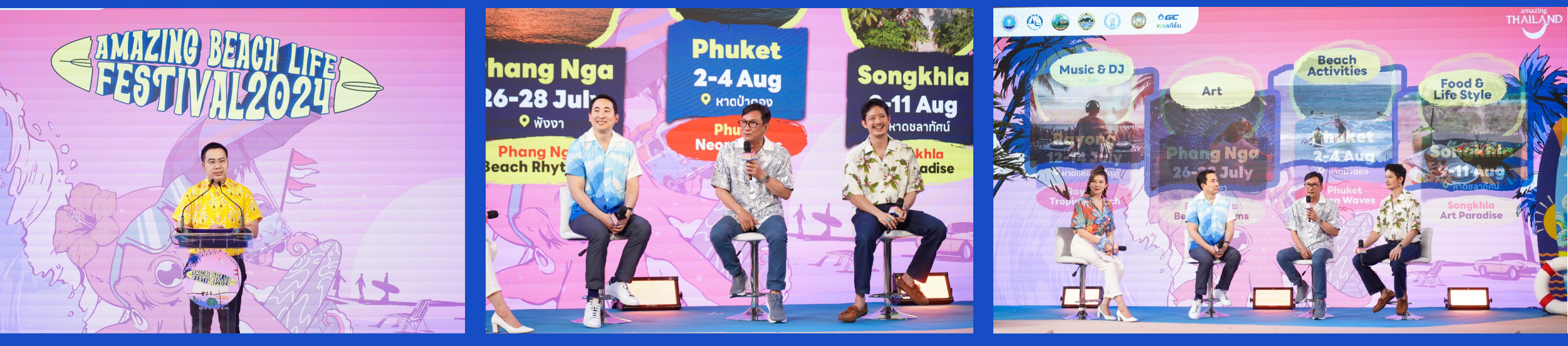 กระทรวงการท่องเที่ยวและกีฬา โดย การท่องเที่ยวแห่งประเทศไทย (ททท.) แถลงข่าวเปิดตัวโครงการ Amazing Beach Life Festival งานเทศกาลดนตรี กีฬา และศิลปะริมชายหาด จัดเต็ม 4 พื้นที่ Beach Life (ระยอง - พังงา - ภูเก็ต - สงขลา) โดยมี ดร.พลภูมิ วิภัติภูมิประเทศ ผู้ช่วยรัฐมนตรีประจำกระทรวงการท่องเที่ยวและกีฬา พร้อมด้วย นายอภิชัย ฉัตรเฉลิมกิจ รองผู้ว่าการด้านสินค้าและธุรกิจท่องเที่ยวททท. และ ดร.ชญาน์ จันทวสุ รองกรรมการผู้จัดการใหญ่สายงานความยั่งยืนองค์กร บริษัท พีทีที โกลบอล เคมิคอล จำกัด (มหาชน) และ เป้ อารักษ์ อมรศุภศิริ นักแสดงผู้ชื่นชอบการท่องเที่ยวสไตล์ Beach Vibes ให้เกียรติเข้าร่วมงาน ณ ห้องโถงธนะรัชต์ ชั้น 1 อาคาร ททท. เพื่อส่งมอบประสบการณ์ท่องเที่ยวด้วยบิ๊กอีเวนต์ พร้อมปลุกกระแสการท่องเที่ยวไทยช่วงกรีนซีซั่น