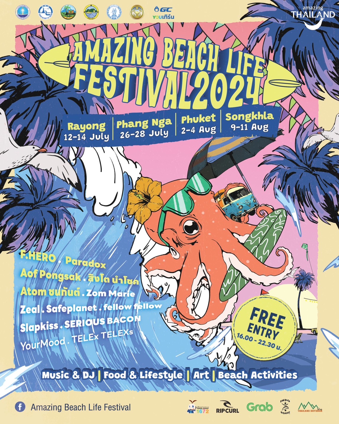 กิจกรรม Amazing Beach Life Festival กำหนดจัดขึ้นตามคอนเซ็ปต์ใน 4 พื้นที่ ได้แก่ 1) จังหวัดระยอง Tropical Beach นำเสนอสีสันความสดใสกับระยองเมืองอาหารและแหล่งผลไม้ภาคตะวันออก วันที่ 12-14 กรกฎาคม 2567 ณ หาดแหลมเจริญ 2) จังหวัดพังงา Beach Rhythms เอ็นจอยไปกับบรรยากาศปาร์ตี้และความสุขของทะเลฝั่งอันดามัน วันที่ 26-28 กรกฎาคม 2567 3) จังหวัดภูเก็ต Neon Waves ความสนุกสนานค่ำคืนเมืองป่าตองพร้อมสีสันจากแสงนีออนสะท้อนลงผิวน้ำทะเลตอนกลางคืน วันที่ 2-4 สิงหาคม 2567 ณ หาดป่าตอง และ 4) จังหวัดสงขลา Art Paradise นำเสนอกลิ่นอายเมืองเก่าแบบฉบับสงขลาเนรมิตรชายหาดให้เต็มไปด้วยสีสันแห่งศิลปะ วันที่ 9-11 สิงหาคม 2567 ณ หาดชลาทัศน์ พบกับกิจกรรมต่างๆ ภายในงานมากมาย เอาใจผู้ชื่นชอบการท่องเที่ยวสไตล์ Beach Vibes ด้วยกิจกรรม Beach Life อาทิ Sup-Board ที่จัดเต็มให้ผู้ร่วมงานได้มาทดลองเล่นและมีผู้เชี่ยวชาญให้คำแนะนำอย่างใกล้ชิด ชมการแสดงดนตรีจากศิลปินชื่อดังในบรรยากาศริมชายหาดสุดชิล อาทิ F.Hero, พาราด็อกซ์ , อ๊อฟ ปองศักดิ์ , สิงโต นำโชค, อะตอม ชนกันต์, ส้ม มารี, วงซีล, Safeplanet, Fellow Fellow, Slapkiss, Serious Bacon, YourMood, TELEx TELEXs และการแสดงจาก DJ ชั้นนำของประเทศไทยที่จะมามอบความสนุกสนานเพลิดเพลินให้ตลอดทั้งงาน แต่งแต้มสีสันบนเรือนร่างด้วย Tattoo Beach สีสันสดใสลวดลายบีชสไตล์ พร้อมสนุกสนานกับ Workshop DIY ที่ให้ผู้เข้าร่วมงานได้สร้างสรรค์ผลงานศิลปะในสไตล์ของตนเองผ่านกิจกรรม Beach Painting วาดลวดลายลงบนถาดไม้และพวงกุญแจ เช็กอินถ่ายภาพกับจุดถ่ายภาพต่าง ๆ ภายในงานทั้ง Installation Art และ Inflatable Landmark ที่นำอัตลักษณ์โดดเด่นของแต่ละพื้นที่การจัดงานมารังสรรค์เป็นมุมถ่ายภาพสุดอลังการ เต็มอิ่มกับการออกร้านจำหน่ายผลิตภัณฑ์ท้องถิ่น รวมทั้งอาหารจาก Food Truck และ Beach Bar ริมทะเล สินค้าแฟชั่นแบบจัดเต็ม พร้อมยกทัพผู้ประกอบการที่ได้รับรางวัลอุตสาหกรรมท่องเที่ยวไทย (Thailand Tourism Awards) มาออกบูทให้ผู้ร่วมงานได้เที่ยวชม ชิม ชอป ใช้ กันอย่างจุใจ