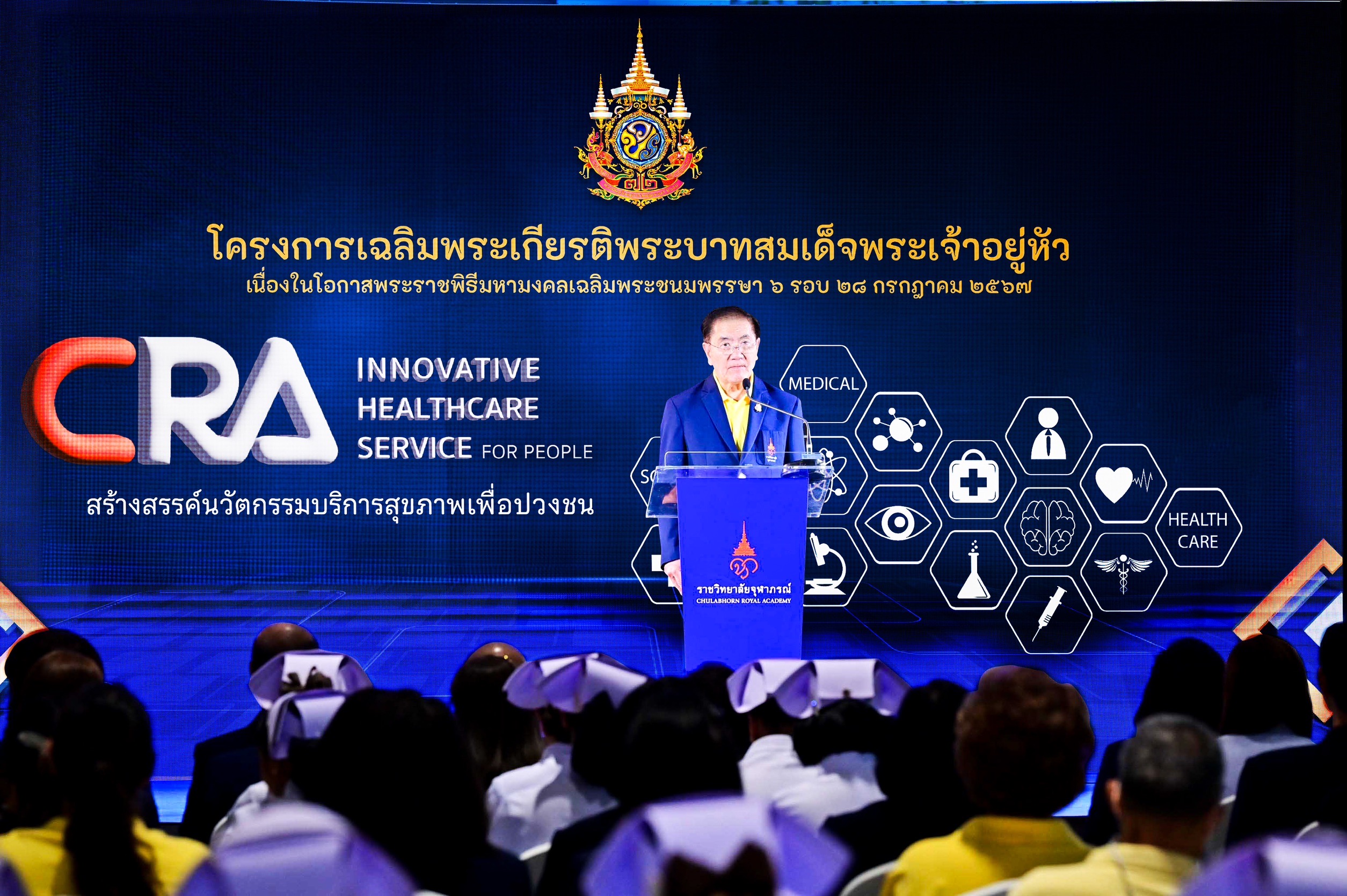 ศาสตราจารย์เกียรติคุณ นายแพทย์รัชตะ รัชตะนาวิน รักษาการรองเลขาธิการราชวิทยาลัยจุฬาภรณ์ แถลงถึงการดำเนินงานจัดโครงการเฉลิมพระเกียรติ ฯ ของราชวิทยาลัยจุฬาภรณ์ เพื่อน้อมนำแนวพระราชปณิธาน พระราชดำริ และพระบรมราโชบายของพระบาทสมเด็จพระเจ้าอยู่หัวเกี่ยวกับการดูแลสุขภาพพลานามัยของประชาชน อันเป็นปัจจัยสำคัญต่อการสร้างสรรค์ทรัพยากรบุคคลที่มีคุณภาพและเป็นพลังในการพัฒนาประเทศชาติ โดยราชวิทยาลัยจุฬาภรณ์ได้เสนอจัดทำโครงการในนามราชวิทยาลัยจุฬาภรณ์ภายใต้แนวคิด สืบสาน–รักษา-ต่อยอด พระราชปณิธาน สร้างสรรค์นวัตกรรมบริการสุขภาพเพื่อปวงชนเข้าร่วมเป็นโครงการและกิจกรรมร่วมเฉลิมพระเกียรติพระบาทสมเด็จพระเจ้าอยู่หัว เนื่องในโอกาสพระราชพิธีมหามงคลเฉลิมพระชนมพรรษา ๖ รอบ ๒๘ กรกฎาคม ๒๕๖๗ กับทางรัฐบาล จำนวน ๘ โครงการ ครอบคลุมการดำเนินงานในทุกมิติของราชวิทยาลัยจุฬาภรณ์ทั้งด้านการให้บริการวิชาการและวิชาชีพด้านสุขภาพ การจัดการศึกษาสร้างบุคลากรที่มีความสำคัญและตอบสนองต่อความต้องการของประเทศ การวิจัยสร้างองค์ความรู้และนวัตกรรมเพื่อนำไปพัฒนาระบบบริการสุขภาพ ตลอดจนสืบสานพระปณิธานใน ศาสตราจารย์ ดร. สมเด็จพระเจ้าน้องนางเธอ เจ้าฟ้าจุฬาภรณวลัยลักษณ์ อัครราชกุมารี กรมพระศรีสวางควัฒน วรขัตติยราชนารี องค์ประธานและนายสภาราชวิทยาลัยจุฬาภรณ์ ในการช่วยเหลือประชาชนให้มีสุขภาพที่ดีและมีคุณภาพชีวิตที่ได้มาตรฐาน โดยมีเป้าหมายคือการนำวิทยาการขั้นสูงและนวัตกรรมไปใช้ในการสร้างสุขภาวะที่ดี ภายใต้ปรัชญา เป็นเลิศเพื่อทุกชีวิต โดยโครงการเฉลิมพระเกียรติพระบาทสมเด็จพระเจ้าอยู่หัว เนื่องในโอกาสพระราชพิธีมหามงคลเฉลิมพระชนมพรรษา ๖ รอบ ในนามราชวิทยาลัยจุฬาภรณ์ จำนวน ๘ โครงการ ประกอบด้วย