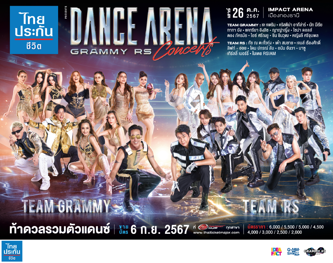 6.ไทยประกันชีวิต presents Dance Arena Grammy RS Concerts’ GRAMMY X RS ขอท้าดวลรวมตัวสายแดนซ์ ในยุค 90’s Versary, 2K Celebration Concert, Hit 100 และ Hit 100 Vol.2 เป็นการรวมตัวของ 27 ศิลปินตัวตึงสายแดนซ์ยุค 90 – 2000 ไว้บนเวทีเดียวกัน ไม่ว่าจะเป็น ‘ทีมแกรมมี่’ นำโดย เจ เจตริน, คริสติน่า อากีล่าร์, นัท มีเรีย, ทาทา ยัง, แคทรียา อิงลิช, ไชน่า ดอลส์, ญาญ่าญิ๋ง, ตอง ภัครมัย, ไอซ์ ศรัณยู, ชิน ชินวุฒ, หญิงลี ศรีจุมพล และ ‘ทีมอาร์เอส’ นำโดย ทัช ณ ตะกั่วทุ่ง, เต๋า สมชาย, เจมส์ เรืองศักดิ์, ลิฟท์ – ออย, โดม ปกรณ์, อนัน อันวา, บาซู, เกิร์ลลี่ เบอร์รี่, ใบเตย RSIAM ที่ขนเพลงเต้นในตำนานมาไว้บนเวทีนี้ จัดขึ้นวันเสาร์ที่ 26 ตุลาคม 2567 ณ อิมแพ็ค อารีน่า เมืองทองธานี พร้อมเปิดจำหน่ายบัตร 6 กันยายน 2567 ราคา 6,000 / 5,500 / 5,000 / 4,000 / 3,000 / 2,500 / 2,000 ที่ไทยทิคเก็ตเมเจอร์ทุกสาขา และ http://www.thaiticketmajor.com
