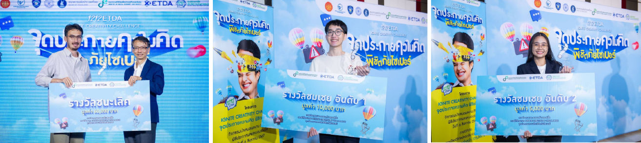 สำนักงานพัฒนาธุรกรรมทางอิเล็กทรอนิกส์ หรือ สพธอ. โดย ศูนย์ช่วยเหลือและจัดการปัญหาออนไลน์ (1212 ETDA) จัดงาน Pitching Day มอบรางวัลโครงการจุดประกายความคิด พิชิตภัยไซเบอร์ ภายใต้หัวข้อ “สร้างสรรค์โลกดิจิทัลปลอดภัย ร่วมเตือนภัยไซเบอร์” ซึ่งเปิดพื้นที่ให้กับนักเรียน นักศึกษา และประชาชนทั่วไป ในการสร้างสรรค์ออกแบบ และนำเสนอสื่อประชาสัมพันธ์ที่เกี่ยวกับความปลอดภัยบนโลกออนไลน์ในรูปแบบต่าง ๆ เพื่อก้าวสู่การเป็นพลเมืองดิจิทัลที่มีคุณภาพของสังคมไปพร้อมกัน ภายในงานได้รับเกียรติจาก ดร.ชัยชนะ มิตรพันธ์ ผู้อำนวยสำนักงานพัฒนาธุรกรรมทางอิเล็กทรอนิกส์ พร้อมด้วยนายมีธรรม ณ ระนอง รองผู้อำนวยสำนักงานพัฒนาธุรกรรมทางอิเล็กทรอนิกส์ ผู้ได้รับรางวัลชนะเลิศ ได้แก่ นายอรุณกร พิค ทีม MI ชื่อผลงาน โปรดตามให้ทัน รองชนะเลิศอันดับ 1 ได้แก่ ทีม Crack Core Studio ชื่อผลงาน มิตร QR รองชนะเลิศอันดับ 2 ได้แก่ ทีม Retake ชื่อผลงาน ไม่ชัวร์...ให้เช็ค รางวัลชมเชยอันดับ 1 ทีมแมรี่ซู ชื่อผลงาน กระต่ายกับเต่า และรางวัลชมเชยอันดับ 2 ชื่อทีม ZIZ ชื่อผลงาน สติ รู้เท่า รู้ทัน ป้องกันการถูกหลอก (เมื่อวันอังคารที่ 6 สิงหาคม 2567 ณ ห้องสุรศักดิ์ 1 ชั้น 11 โรงแรมอีสติน แกรนด์ สาทร)