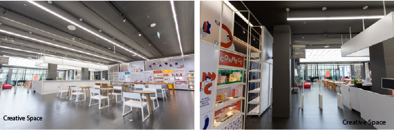 1.1) Creative Space ตั้งอยู่บริเวณชั้น 5 อาคารส่วนหน้า (Front Building) ลักษณะเป็นพื้นที่ห้องสี่เหลี่ยมผืนผ้า ขนาด 66 ตร.ม. แบบนั่งฟังบรรยาย (Theater) ได้ประมาณ 30 - 50 ที่นั่ง เหมาะสำหรับการจัดงานสัมมนา เสวนา นิทรรศการขนาดเล็ก ราคา 15,000 บาท/วัน