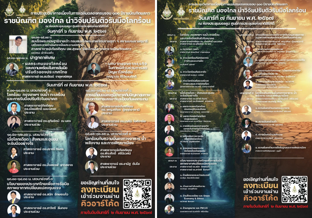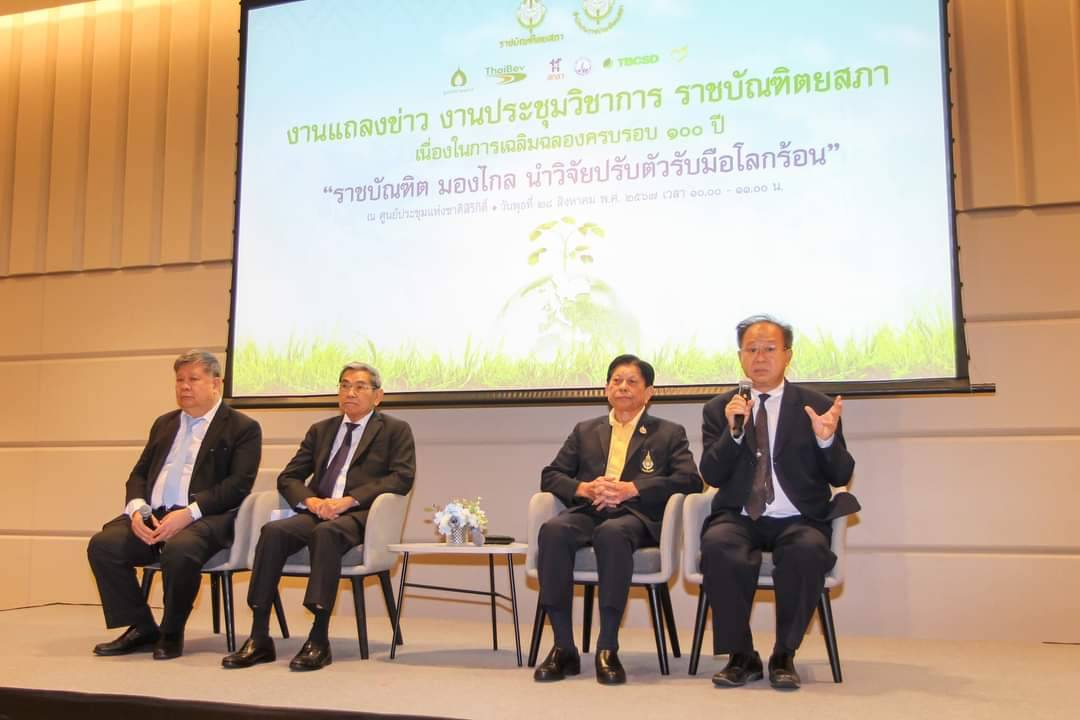 ราชบัณฑิตยสภา โดย ศาสตราจารย์เกียรติคุณ นายแพทย์สุรพล อิสรไกรศีล ราชบัณฑิต นายกราชบัณฑิตยสภา เป็นประธานจัดงานแถลงข่าว งานประชุมวิชาการ “ราชบัณฑิต มองไกล นำวิจัย ปรับตัวรับมือโลกร้อน” เพื่อเฉลิมฉลอง ในโอกาสครบรอบ ๑๐๐ ปีราชบัณฑิตยสภา โดยในครั้งนี้ ได้รับเกียรติจาก ศาสตราจารย์ ดร.สมบูรณ์ สุขสำราญ ราชบัณฑิต อุปนายกราชบัณฑิตยสภา พร้อมด้วยศาสตราจารย์ ดร.สนิท อักษรแก้ว ราชบัณฑิต และ ศาสตราจารย์ ดร.ธนวัฒน์ จารุพงษ์สกุล ราชบัณฑิต ร่วมเป็นผู้ดำเนินโครงการฯ ปาฐกถาพิเศษ ซึ่งงานประชุมวิชาการจะจัดขึ้น ในวันศุกร์ที่ ๖ กันยายน พ.ศ. ๒๕๖๗ เวลา ๑๓.๓๐-๑๗.๐๐ น. และวันเสาร์ที่ ๗ กันยายน พ.ศ. ๒๕๖๗ เวลา ๘.๐๐-๑๗.๐๐ น. ณ ห้องบอลรูม ศูนย์การประชุม แห่งชาติสิริกิติ์ นอกจากนี้ ภายในงานแถลงข่าวได้จัดให้มี พิธีมอบเงินสนับสนุนโครงการฯ จากมูลนิธิ สิริวัฒนภักดี, บริษัทไทยเบฟเวอเรจ จำกัด, สำนักงานคณะกรรมการส่งเสริมวิทยาศาสตร์ วิจัยและนวัตกรรม(สกสว.), บริษัท ช.การช่าง จำกัด (มหาชน), องค์กรธุรกิจเพื่อการพัฒนาอย่างยั่งยืน (TBCSD) และมูลนิธิสวนพฤกษศาสตร์ป่าชายเลนนานาชาติ อีกด้วย