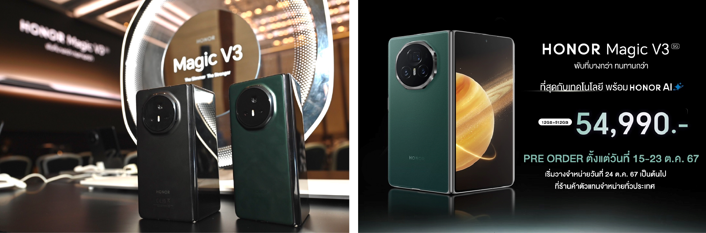 15 ตุลาคม 2567, กรุงเทพฯ – ออเนอร์ (HONOR) ผู้ให้บริการอุปกรณ์อัจฉริยะชั้นนำระดับโลก เดินหน้ารุกตลาดสมาร์ตโฟนจอพับในประเทศไทย มุ่งขยายกลุ่มลูกค้าระดับไฮเอนด์ ด้วยการเปิดตัวสมาร์ตโฟนจอพับระดับแฟลกชิป HONOR Magic V3 ภายใต้สโลแกน “พับที่บางกว่า ทนทานกว่า” ชูโรงด้วยดีไซน์บางเฉียบและทนทานที่สุดในโลก บางเพียง 9.2 มิลลิเมตร เมื่อพับ และ 4.35 มิลลิเมตร เมื่อกางออก ผสานแบตเตอรี่ซิลิคอนคาร์บอนที่บางแต่ให้ความจุจัดเต็มถึง 5150mAh พร้อมเสริมพลังด้วย HONOR AI อัจฉริยะ เพื่อประสบการณ์การใช้งานที่ราบรื่น พร้อมฟีเจอร์ Circle to Search with Google เพิ่มความสะดวกในการค้นหาในทุกสถานการณ์ ตลอดจนยกระดับการใช้งานด้วยการดีไซน์จากวัสดุประสิทธิภาพสูงอย่าง HONOR Anti-scratch NanoCrystal Shield และ IPX8 Waterproof เปิดตัวในราคา 54,990 บาท และพิเศษสุดกับโปรโมชันช่วงพรีออเดอร์ระหว่างวันที่ 15 - 23 ตุลาคม 2567 สามารถนำมือถือรุ่นใดหรือยี่ห้อใดก็ได้มาแลก รับส่วนลดสูงสุด 10,000 บาท* พร้อมประกันหน้าจอแตก 1 ปี* เริ่มจำหน่ายตั้งแต่วันที่ 24 ตุลาคม 2567 เป็นต้นไป