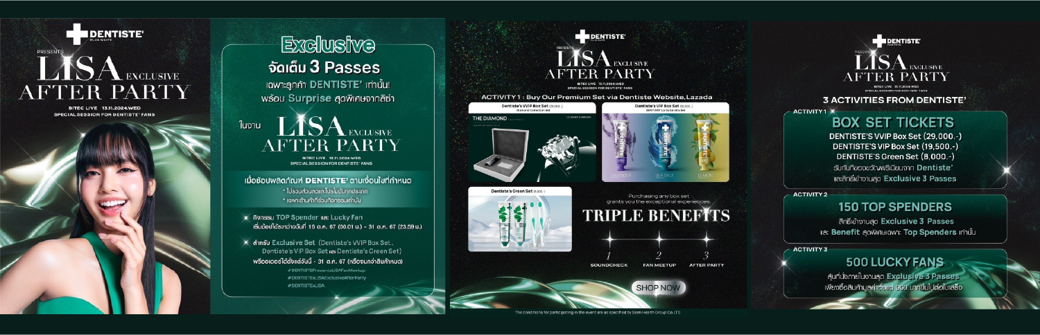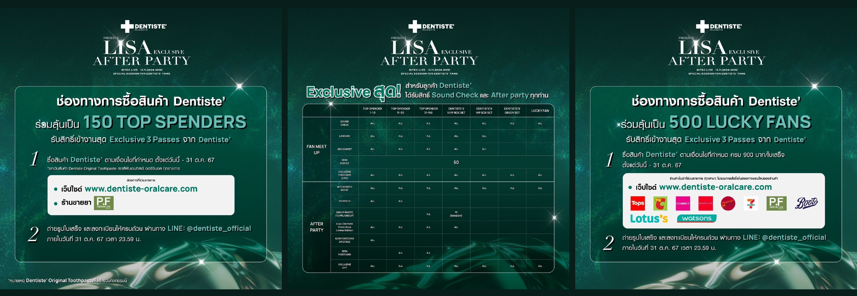 แฟน ๆ ลิซ่า สามารถติดตามรายละเอียด เช็กสิทธิพิเศษ และสอบถามเพิ่มเติมได้ทางเว็บไซต์ https://www.dentiste-oralcare.com เฟซบุ๊ก Dentiste และ LINE Official Account: @dentiste_official