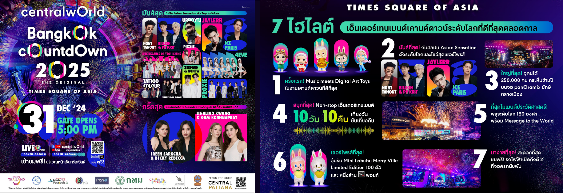 ครั้งแรกของโลก! Digital Art Toys Countdown: ปรากฏการณ์ Music Meets Digital Art Toys นำโดย Labubu, Zimomo, Estella และคาแรกเตอร์ดังระดับโลก ที่จะมาสร้างโมเมนต์สุดพิเศษฉลองศักราชใหม่ มันส์ที่สุดกับโชว์ระดับโลก: ศิลปิน Asian Sensation นำโดย บิวกิ้น – พีพี, ซี-นุนิว, Jayler, PROXIE, PIXXIE, 4EVE, Ice Paris, นนท์ ธนนท์, URBOYTJ, BUS, Three Man Down และ Tattoo Colour พร้อมเซอร์ไพรส์จาก Countdown Angels: ฟรีน-สโรชา และ เบ็คกี้-รีเบคก้า และ หลิงหลิง-ศิริลักษณ์ คอง การปรากฏตัวครั้งแรกบนเวทีเคานต์ดาวน์ของ โอปอล สุชาตา รองอันดับ 3 Miss Universe ร่วมนับถอยหลังพร้อมกันที่เซ็นทรัลเวิลด์ ใหญ่ที่สุดด้วยจอ PanOramix 3,790 ตร.ม.: จออินเตอร์แอคทีฟที่ใหญ่ที่สุดในโลก พร้อมกราฟิกสุดอลังการและแสงสีเสียงจัดเต็ม