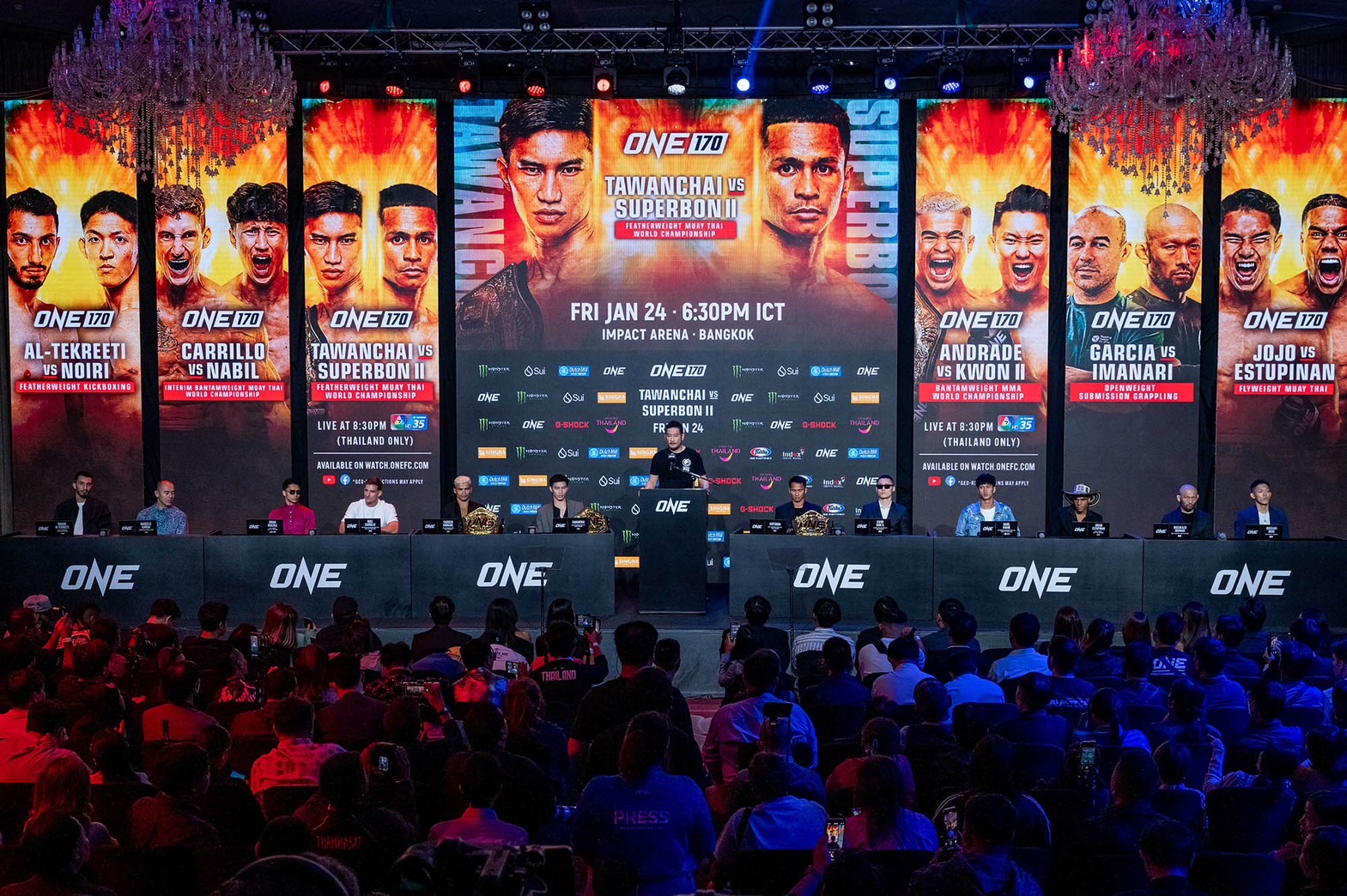 วัน แชมเปียนชิพ แถลงข่าวศึก ONE 170 ศึกใหญ่ศึกแรกของปี ประเดิมจัดที่ไทย อัดแน่นซูเปอร์สตาร์และนักกีฬาระดับแม่เหล็กรวม 12 คู่ ครบทุกกติกา มีการชิงเข็มขัดแชมป์โลก 3 เส้น หนึ่งในนั้นคือการรีแมตช์ครั้งสำคัญ ชิงบัลลังก์มวยไทยระหว่าง “ตะวันฉาย VS ซุปเปอร์บอน” ที่อิมแพ็ค อารีนา เมืองทองธานี ในวันศุกร์ที่ 24 ม.ค.นี้ เริ่มคู่แรกเวลา 18.30 น. โดยจะมีนักแสดง-ทีมงานภาพยนตร์ฟอร์มยักษ์ “The Beast In Me” ซึ่งนำแสดงโดยนักแสดงเจ้าของรางวัลออสการ์ "รัสเซล โครว์”และ“แดเนียล แม็คเฟอร์สัน" มาถ่ายทำฉากสำคัญ และบันทึกภาพการเก็บตัวตลอดทั้งสัปดาห์ จนถึงฉากแอ็กชันบนเวทีแข่งขันด้วย