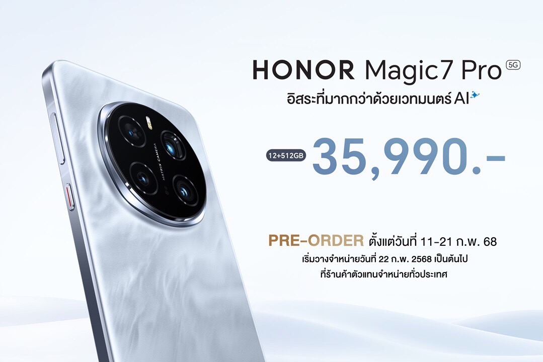 11 กุมภาพันธ์ 2568, กรุงเทพฯ – ออเนอร์ (HONOR) ผู้ให้บริการอุปกรณ์อัจฉริยะชั้นนำระดับโลก ประกาศเปิดตัวสมาร์ตโฟนระดับแฟลกชิป HONOR Magic7 Pro 5G อย่างเป็นทางการ ภายใต้สโลแกน “อิสระที่มากกว่าด้วยเวทมนต์ AI” โดดเด่นด้วยเทคโนโลยีกล้อง AI สุดล้ำที่ปฏิวัติการถ่ายภาพได้อย่างสมบูรณ์แบบ ด้วยความสามารถเหนือชั้นกับกล้องเทเลโฟโต้ถ่ายภาพคมชัดความละเอียด 200 ล้านพิกเซล ผสานพลัง AI Motion Sensing Capture ตัวช่วยเก็บภาพเคลื่อนไหวในทุกอารมณ์ได้อย่างไร้ที่ติ พร้อมเสริมเกราะความปลอดภัยด้วย AI Deepfake Detection เทคโนโลยีอัจฉริยะที่ช่วยตรวจจับและป้องกันภาพปลอมแปลงอัตโนมัติได้อย่างแม่นยำ ตลอดจนก้าวข้ามกำแพงภาษาด้วย AI Translation ที่เปลี่ยนทุกการสนทนาให้ไร้ข้อจำกัด แปลภาษาได้แบบเรียลไทม์ เพื่อการสื่อสารที่ราบรื่นและง่ายกว่าที่เคย เปิดตัวในราคา 35,990 บาท* โดยเปิดให้พรีออเดอร์ พร้อมรับข้อเสนอสุดพิเศษทั้งออนไลน์และออฟไลน์ได้แล้วตั้งแต่วันนี้ - 21 กุมภาพันธ์ 2568