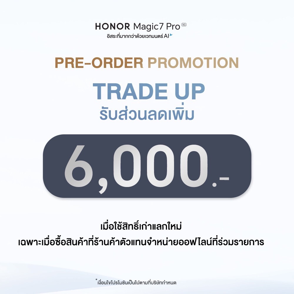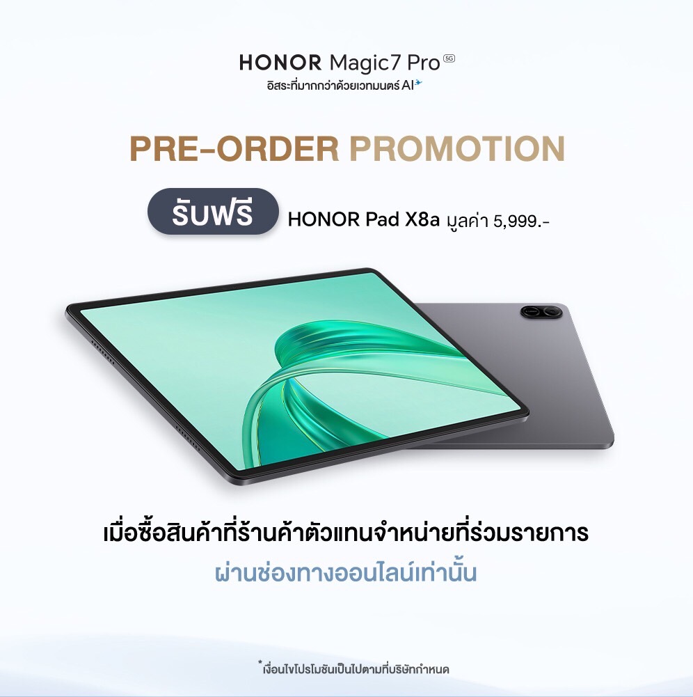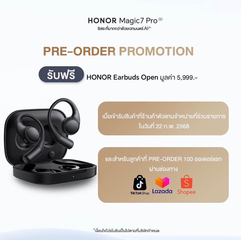 HONOR Magic7 Pro 5G มีทั้งหมด 3 สี ได้แก่ สีเทา (Lunar Shadow Grey), สีฟ้า (Breeze Blue) และสีดำ (Black) เป็นเจ้าของได้ในราคา 35,990 บาท เปิดพรีออเดอร์ตั้งแต่วันที่ 11 – 21 กุมภาพันธ์ 2568 โดยในช่องทางออฟไลน์ รับสิทธิ์เครื่องเก่าแรกใหม่ พร้อมส่วนลดเพิ่มสูงสุด 6,000 บาท* สามารถเข้ารับสินค้า ณ HONOR Experience Store สาขาที่ร่วมรายการในวันที่ 22 กุมภาพันธ์ 2568 รับฟรี HONOR Earbuds Open มูลค่า 5,990 บาท และในช่องทางออนไลน์ รับฟรี HONOR X8a มูลค่า 5,999 บาท และพิเศษสุดสำหรับ 100 ออเดอร์แรก รับฟรี HONOR Earbuds Open มูลค่า 5,990 บาท เฉพาะช่องทาง Online สามารถติดตามรายละเอียดได้ที่ https://bit.ly/40QmBnk