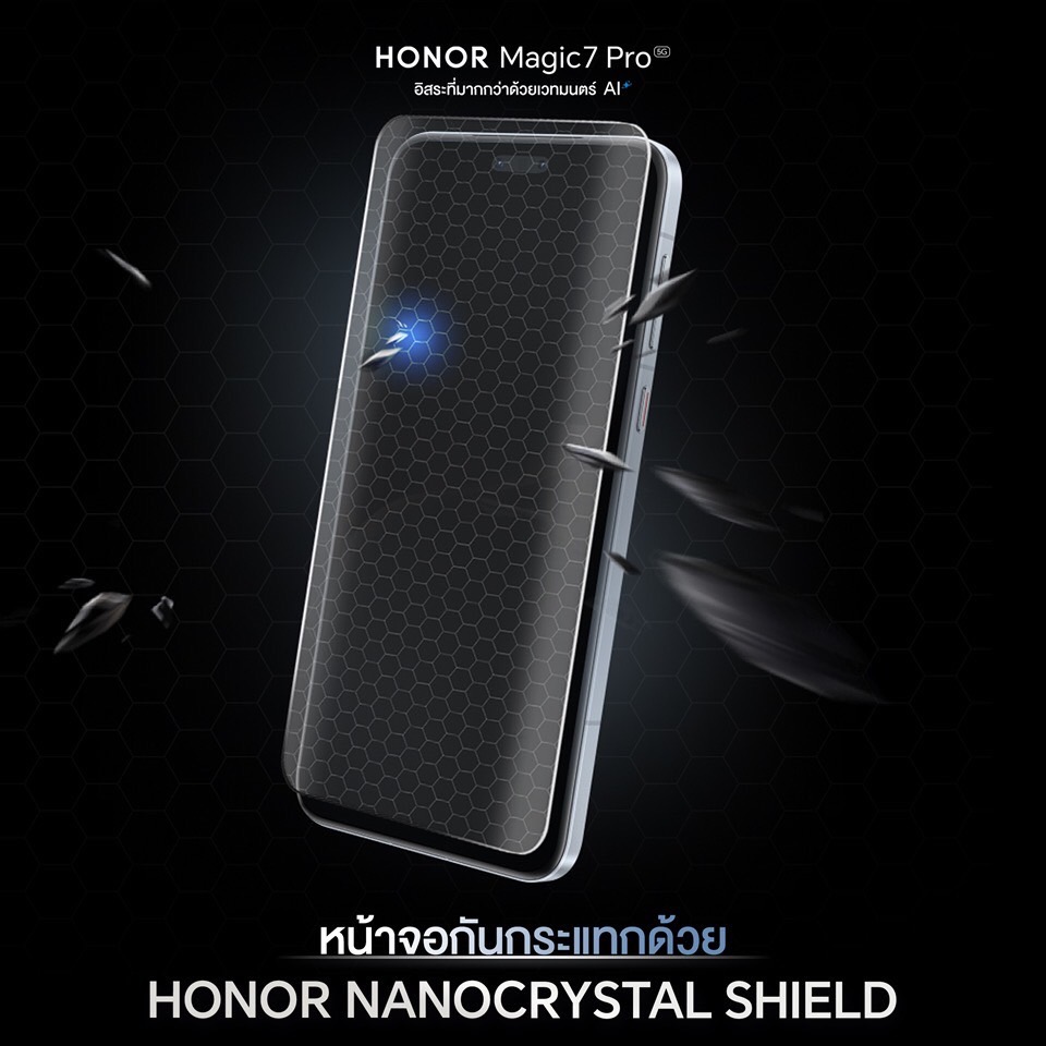 HONOR Magic7 Pro ยังมาพร้อม HONOR NanoCrystal Shield ที่ทนทานกว่ากระจกมาตรฐานถึง 10 เท่า ปกป้องสมาร์ตโฟนจากการตกหล่นและความเสียหายในชีวิตประจำวัน ด้วยมาตรฐาน IP68 ป้องกันฝุ่นและสามารถทนน้ำลึก 1.5 เมตร นาน 30 นาที รวมถึง IP69 ที่ทนทานต่อสภาพแวดล้อมรุนแรง เช่น แรงดันและอุณหภูมิสูง โดยไม่กระทบต่อประสิทธิภาพการทำงาน ช่วยให้ HONOR Magic7 Pro ทนทานและคงความสมบูรณ์ในทุกการใช้งาน