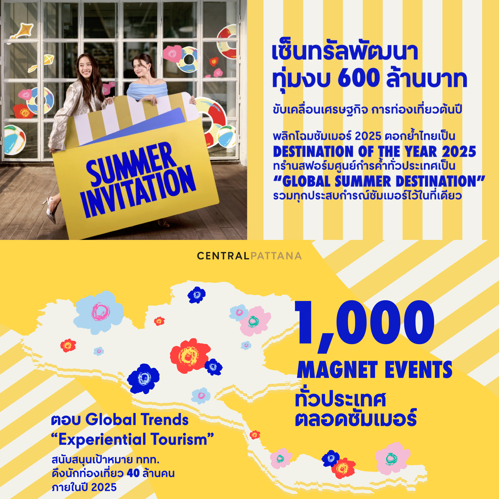 หนึ่งในพันธมิตรสำคัญที่ร่วมขับเคลื่อนเศรษฐกิจไทยผ่านการจัดกิจกรรมและอีเวนต์อย่างต่อเนื่อง คือ เซ็นทรัลพัฒนา ซึ่งเป็นกำลังสำคัญในการกระตุ้นการท่องเที่ยวผ่านเครือข่ายศูนย์การค้าทั่วประเทศ โดยในปี 2568 นี้ แคมเปญ ‘Summer Invitation 2025’ จะเป็นหนึ่งในกลไกหลักที่ช่วยผลักดันนโยบายของ ททท. ด้วยเครือข่ายศูนย์การค้าทั้ง 42 สาขา ที่กระจายอยู่ในทุกภูมิภาคของไทย ทำหน้าที่เป็นศูนย์กลางเชื่อมโยงนักท่องเที่ยวทั้งชาวไทยและชาวต่างชาติให้เดินทางเข้าสู่เมืองหลักและเมืองรอง คาดการณ์ว่าแคมเปญดังกล่าวจะสามารถช่วยกระตุ้นตลาดท่องเที่ยวให้เติบโตได้อย่างมีนัยสำคัญ
