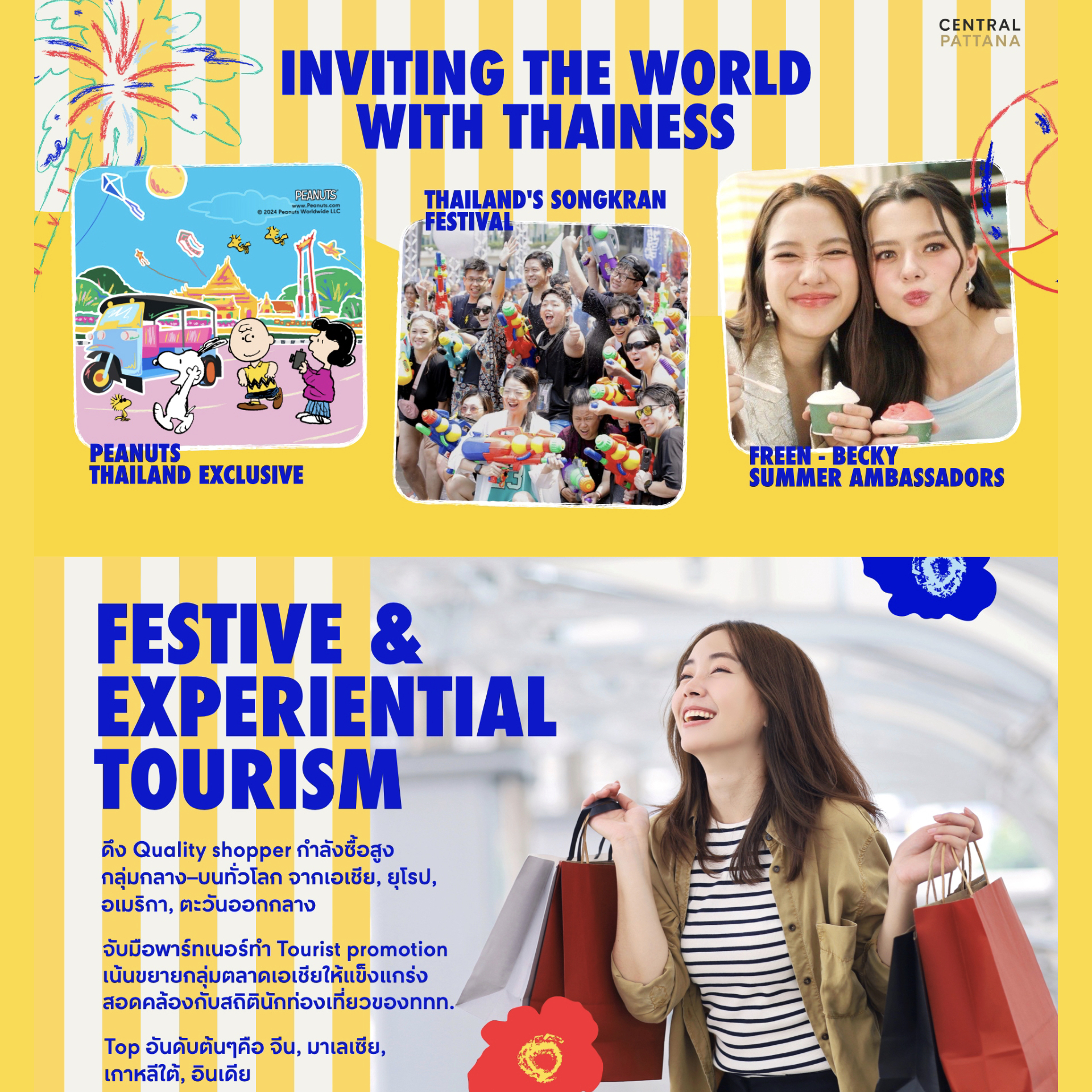 ‘FESTIVE & EXPERIENTIAL TOURISM’ ชูไทยเป็น World Festive Destination ดึงกลุ่มนักช้อประดับกลาง-บน ทั่วโลก จากเอเชีย, ยุโรป, อเมริกา, ตะวันออกกลางให้เข้ามาท่องเที่ยวและจับจ่ายในเมืองไทย ผ่าน Local Thai Festive ทั่วประเทศ กว่า 1,000 อีเวนต์ อาทิ Pattaya International Kite on the Beach 2025 รวมถึงมีงานแสดงว่าวและบอลลูน อีกกว่า 8 สาขา นอกจากนี้ ยังมีงาน สมุยนีออนรัน, งาน Summer Fashion Show ครั้งใหญ่ที่เซ็นทรัลเวิลด์, งาน Summer Sport Fashion x Vogue รวมถึง งาน Travel Fair 2025 ที่ห่างหายกันไปนานและกลับมาอีกครั้งนี้ปีนี้ ที่เซ็นทรัล ภูเก็ต, งาน Summer Scooper Party ต้อนรับ Summer นี้ดับร้อนด้วย Ice cream & Summer Sweet ที่เซ็นทรัล เชียงใหม่ แอร์พอร์ต งานเทศกาลกินกุ้งจันท์ ครั้งที่ 2 ที่ประสบความสำเร็จอย่างมากและจัดยิ่งใหญ่กว่าเดิม ที่เซ็นทรัลจันทบุรี,งาน Taste Of Samui งานที่รวม Michelin-chef table ชื่อดังที่เซ็นทรัล สมุย และ งาน Begle Club Meeting ร่วมถึงครั้งแรกกับการจัดงาน Pet party on the beachที่จะเป็น Pool Party สำหรับน้องๆ เพื่อนสี่ขาโดยเฉพาะ ที่เซ็นทรัลอีสต์วิลล์ เป็นต้น