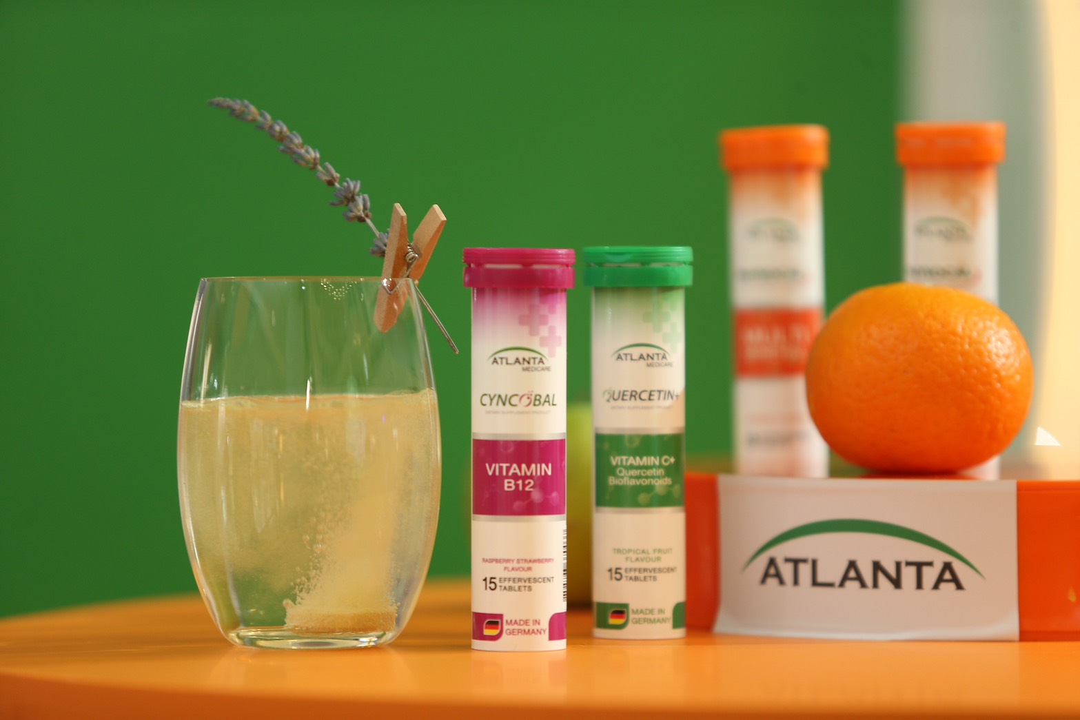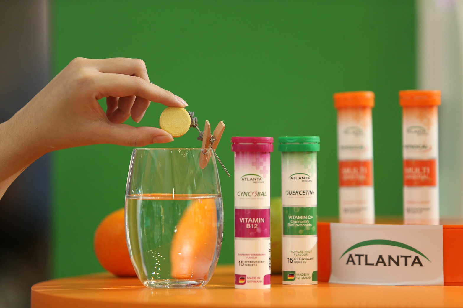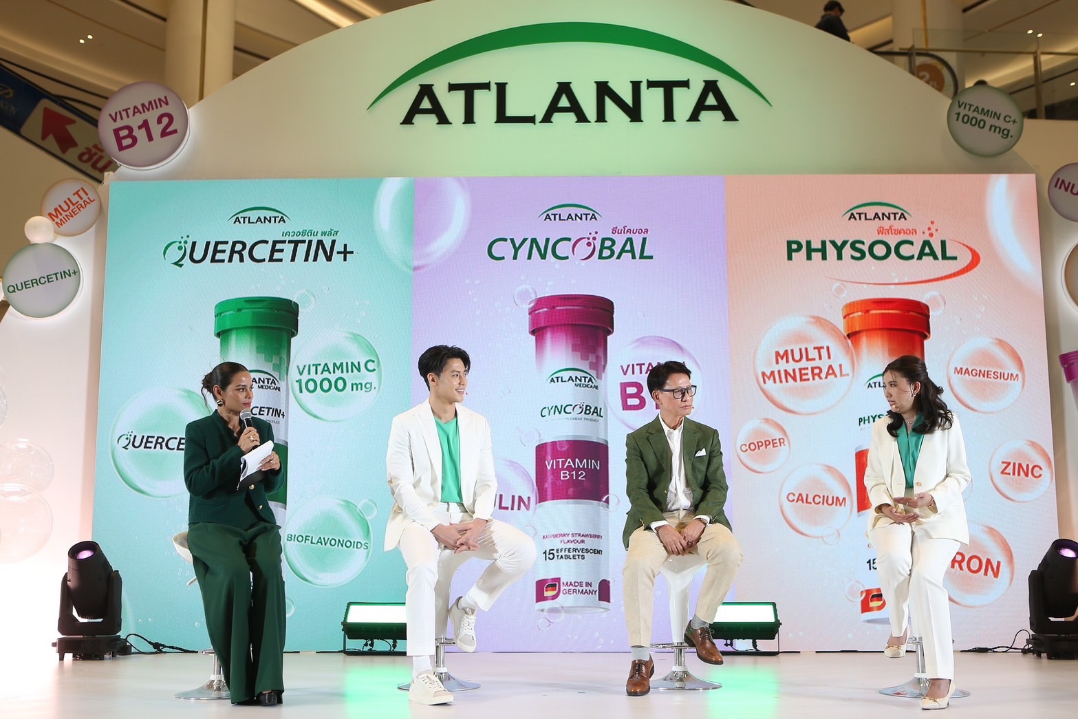 สำหรับผลิตภัณฑ์เสริมอาหาร “วิตามินเม็ดฟู่ดูดซึมเร็ว” แบรนด์แอตแลนต้า เพื่อการดูแลสุขภาพแบบครบทุกมิติ ตอบโจทย์คนยุคใหม่ที่ต้องการทั้งความสะดวกและสุขภาพที่แข็งแรงในทุก ๆ วัน มีให้เลือก 3 สูตร ได้แก่ Quercetin+ รสทรอปิคัลฟรุ๊ต ผสานเควอซิติน วิตามินซี 1,000 มล. และไบโอฟลาโวนอยด์จากส้ม ช่วยเสริมภูมิคุ้มกัน บำรุงการทำงานของปอด ทั้งยังช่วยส่งเสริมการปกป้องระบบทางเดินหายใจจากฝุ่น PM 2.5, Cyncobal รสราสเบอร์รี่-สตรอว์เบอร์รี่ อุดมด้วยวิตามินบี12 และอินูลิน มีส่วนช่วยบำรุงระบบประสาทและสมอง ป้องกันโรคอัลไซเมอร์ และอาการอ่อนเพลีย และ Physocal รสส้ม ที่ผสานมัลติ-มิเนอรัลช่วยรักษาสมดุลของแร่ธาตุในร่างกายและช่วยปลดล็อกศักยภาพของร่างกายให้พร้อมรับทุกความท้าทายในแต่ละวัน