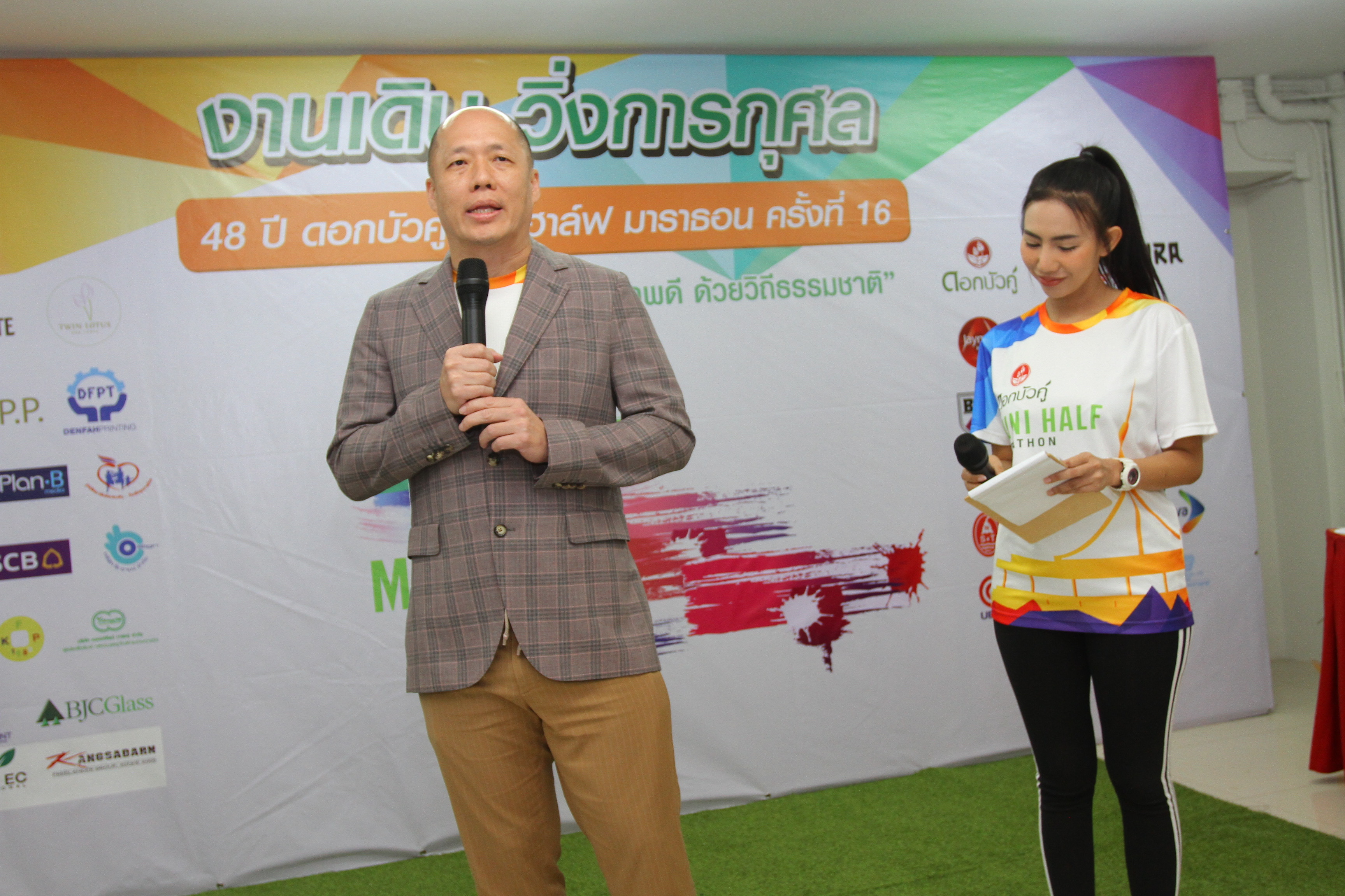 นาย บัณฑิต ลีเลิศพันธ์ กรรมการผู้จัดการ บริษัท ดอกบัวคู่ จำกัด ในฐานะผู้อำนวยการจัดการแข่งขัน เป็นประธานในงานแถลงข่าวการจัดกิจกรรม 48 ปี ดอกบัวคู่ มินิ-ฮาล์ฟ มาราธอน ประจำปี 2568 เมื่อวันที่ 26 มีนาคม 2568 ที่ ห้องประชุมใหญ่ ชั้น 1 บริษัทดอกบัวคู่จำกัด