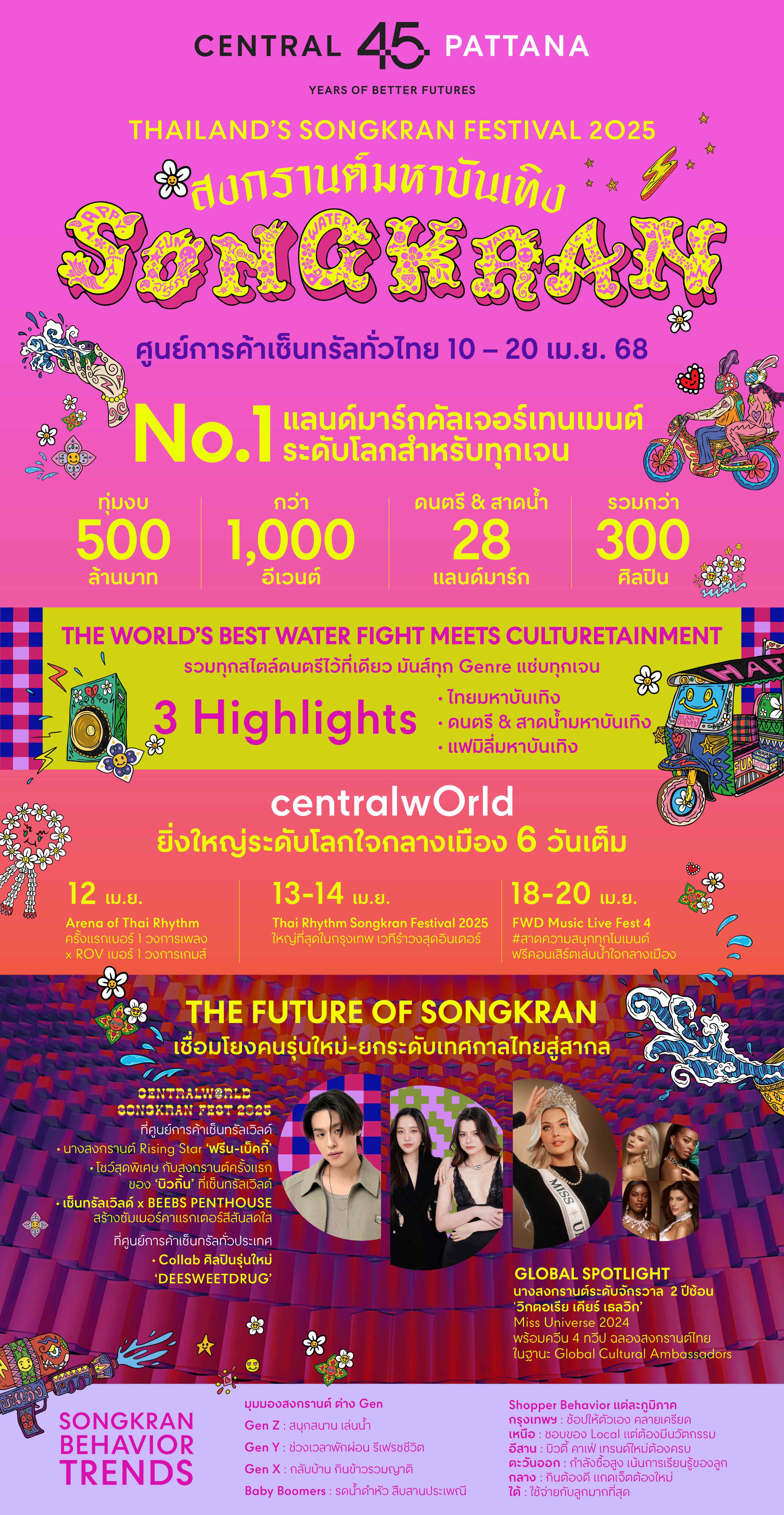 จากอินไซต์ลูกค้า พบว่าแต่ละเจนฯ มีการฉลองสงกรานต์แตกต่างกัน โดย Gen Z มองว่าสงกรานต์คือ ความสนุก เอนเตอร์เทนเมนต์ และการแสดงตัวตนผ่านคอนเสิร์ตและการแต่งตัว , Gen Y มองหาช่วงเวลาพักผ่อน รีเฟรชชีวิต, Gen X และ Baby Boomers ยังคงยึดโยงกับคุณค่าทางจิตใจผ่านการกลับบ้าน รดน้ำดำหัว และสืบสานประเพณี ขณะที่ Gen Alpha ต้องการพื้นที่สนุกและปลอดภัยที่ทั้งครอบครัวสามารถร่วมกิจกรรมได้พร้อมกัน เราจึงดีไซน์ประสบการณ์แบบ Tailor-made ให้ตอบโจทย์ทุกเจนฯ ไม่ว่าจะเป็น งาน CPOT ของดีทั่วไทย สุขใจรับสงกรานต์ ที่เซ็นทรัลเวิลด์ร่วมกับกระทรวงวัฒนธรรม รวบรวมสินค้าทางวัฒนธรรมจาก 77 จังหวัดทั่วประเทศ ยกระดับสินค้าไทยสู่สากลแบบร่วมสมัย และตลาดสินค้าวัฒนธรรมในหลายสาขาทั่วประเทศให้ ช้อป ชิม ลิ้มรส อาหารไทยพื้นถิ่น, กิจกรรมไทยมหาบันเทิง จัดแสดงมรดกทางวัฒนธรรมที่หาชมได้ยาก อาทิ โขน, หุ่นละครเล็ก, รำมโนราห์, นาฏศิลป์ไทย และการแสดงรำไทยประยุกต์ร่วมสมัย รวมทั้งร่วมกับกระทรวงวัฒนธรรม จัดการแสดงกระบี่กระบอง, การแสดงเซิ้งโปงลาง และการแสดงเริงรื่นชื่นสงกรานต์ ร่วมกับ Playland สร้างแลนด์มาร์กสำหรับเด็กๆ และครอบครัว ทั้งลานเล่นน้ำ สวนสนุกเป่าลมและบ่อบอล พร้อม Snoopy Family Zone ให้น้องๆ ได้สนุกกับเครื่องเล่นต่างๆ และการประกวดหนูน้อยสงกรานต์ที่ 10 สาขาทั่วไทย และพื้นที่ Petsumers ให้สัตว์เลี้ยงเล่นน้ำได้ และไฮไลต์แห่งปีกับ The World’s Best Water Fight Entertainment 28 แลนด์มาร์กสาดน้ำสุดมันส์ พร้อมศิลปินกว่า 300 ชีวิตทั่วประเทศ รวมทุกแนวเพลง ทั้งลูกทุ่ง, EDM, Pop, และ Hip-hop สร้างปรากฏการณ์สงกรานต์ที่รวมทุกสไตล์ดนตรีไว้ในที่เดียว ต่อเนื่องกับการดึงศิลปินรุ่นใหม่เจาะกลุ่ม Gen Z นำโดย ‘ฟรีน-เบ็คกี้’ สองสาวฮอตที่สุดตอนนี้กับบทบาทของนางสงกรานต์คู่กันครั้งแรกที่เซ็นทรัลเวิลด์(13 เม.ย.) และ ปีแรกกับการฉลองสงกรานต์สุดบันเทิงไปกับการแสดงสุดพิเศษของ ‘บิวกิ้น’ (14 เม.ย.) ณ ลานมหาสุข เซ็นทรัลเวิลด์ โดยศูนย์การค้าทั่วประเทศได้ Collab กับอาร์ตทิสต์รุ่นใหม่ สร้าง Vibe การตกแต่งศูนย์ฯ จากผลงาน "DEESWEETDRUG" และ ที่เซ็นทรัลเวิลด์กับซัมเมอร์คาแรกเตอร์สีสันสดใสผลงาน BEEBS PENTHOUSE สร้าง Tourist Hub Destination ที่ศูนย์ Tourist malls 10 สาขาทั่วประเทศ ด้วยแม็กเน็ตดึงนักท่องเที่ยวทั่วโลก