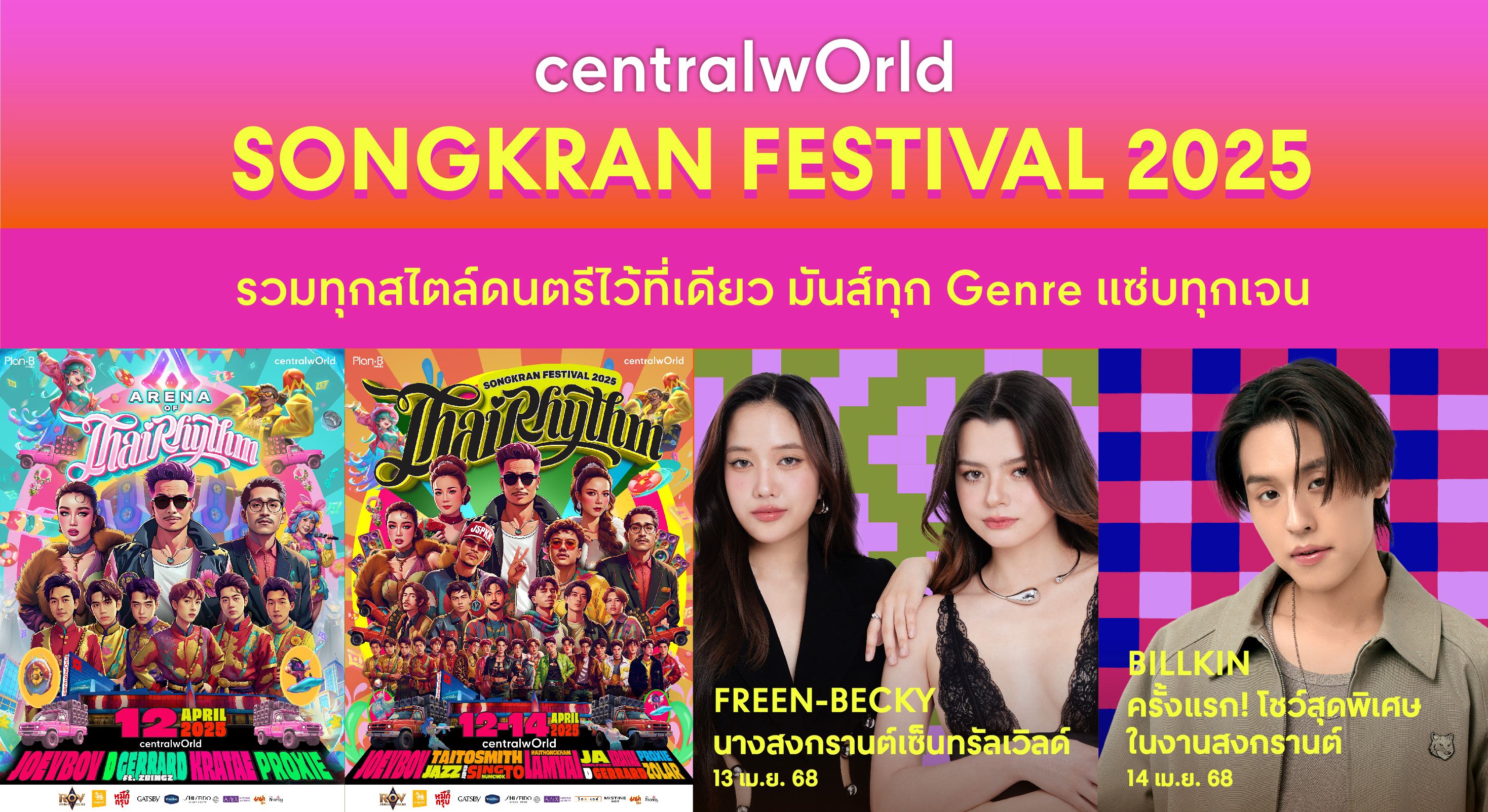 เซ็นทรัลเวิลด์ ผนึก Plan B จัดใหญ่ Thai Rhythm Songkran Festival 2025 (12-14 เม.ย. 68) ครั้งแรกเบอร์ 1 วงการเพลง X ROV เบอร์ 1 วงการเกม จัดเต็มไลน์อัพศิลปินตัวท็อป และเตรียมพบนางสงกรานต์คู่ฮอตที่สุด ‘ฟรีน-สโรชา เบ็คกี้-รีเบคก้า’ และสงกรานต์ครั้งแรกกับ "Billkin" ที่เซ็นทรัลเวิลด์ ณ ลานมหาสุข