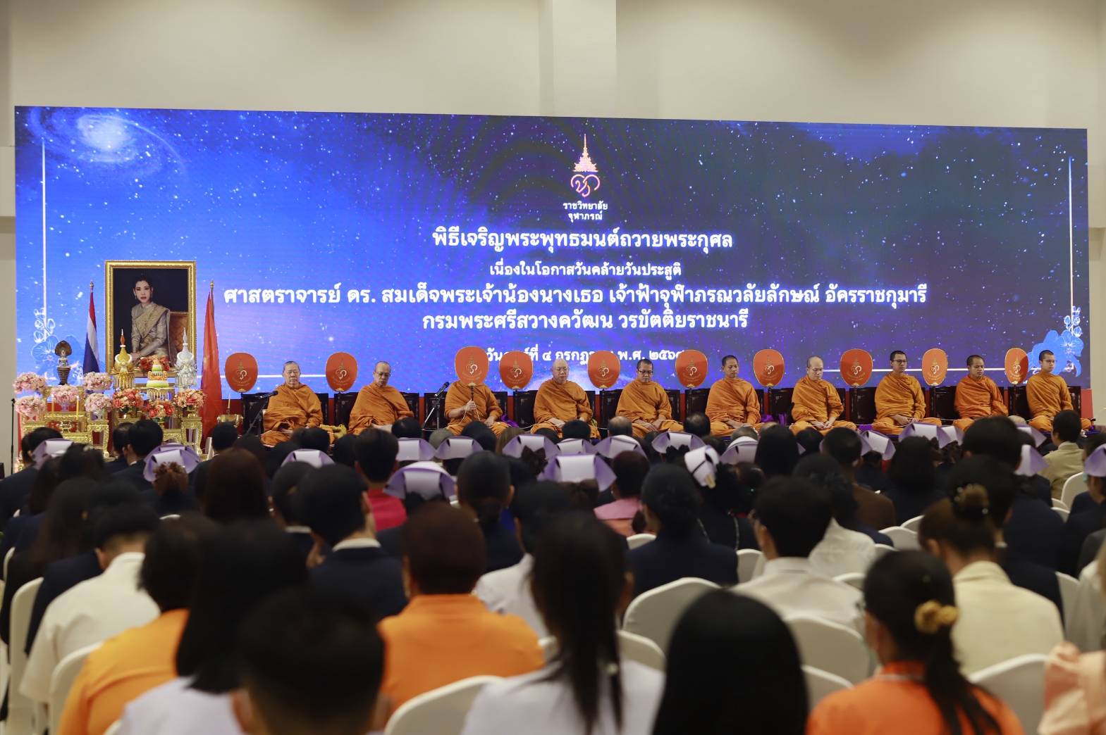 กรุงเทพฯ วันที่ ๔ กรกฎาคม ๒๕๖๘ : ราชวิทยาลัยจุฬาภรณ์ จัดพิธีถวายพระพรชัยมงคลและกิจกรรมเทิดพระเกียรติถวายเป็นพระกุศล เนื่องในโอกาสวันคล้ายวันประสูติ ศาสตราจารย์ ดร. สมเด็จพระเจ้าน้องนางเธอ เจ้าฟ้าจุฬาภรณวลัยลักษณ์ อัครราชกุมารี กรมพระศรีสวางควัฒน วรขัตติยราชนารี องค์ประธานและนายกสภาราชวิทยาลัยจุฬาภรณ์ ทรงเจริญพระชันษา ๖๘ ปี โดยมี สมเด็จพระมหารัชมงคลมุนี (ธงชัย ธมฺมธโช) เป็นประธานฝ่ายสงฆ์ และดร.ฐากูร พานิช รักษาการรองเลขาธิการราชวิทยาลัยจุฬาภรณ์ เป็นประธานในพิธี พร้อมด้วยคณะผู้บริหาร บุคลากรราชวิทยาลัยจุฬาภรณ์ ข้าราชการ บุคลากรจากหน่วยงานสถาบันภาคีเครือข่ายและประชาชนเข้าร่วมพิธี ณ ชั้น ๖ อาคารกรมพระศรีสวางควัฒน โรงพยาบาลจุฬาภรณ์ ราชวิทยาลัยจุฬาภรณ์