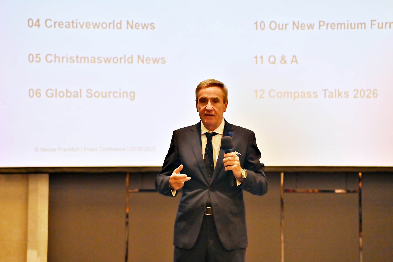 นายสเตฟาน คัวร์ซอว์สกี (Mr. Stephan Kurzawski) รองประธานอาวุโส Messe Frankfurt เปิดเผยว่า เมสเซ่ แฟรงก์เฟิร์ต, เยอรมัน พร้อมแล้วในการจัดงาน Ambiente, Christmasworld และ Creativeworld ซึ่งไม่ได้เป็นเพียงงานแสดงสินค้า แต่เป็น ศูนย์รวมแรงบันดาลใจ เทรนด์ใหม่ระดับโลกและโอกาสทางธุรกิจ ด้านสินค้าไลฟ์สไตล์ ของตกแต่งเทศกาล และงานสร้างสรรค์ ที่เชื่อมโยงผู้ผลิต แบรนด์ ดีไซเนอร์ และผู้ค้าปลีกจาก 170 ประเทศทั่วโลก ผู้ประกอบการทั่วโลกเข้าร่วมงานแสดงสินค้า จำนวนประมาณ 4,700 ราย และคาดว่าจะมีผู้เข้าชมงานประมาณ 1.5 แสนคน เรามุ่งหวังที่จะเห็นผู้ประกอบการไทยเข้ามามีบทบาทมากขึ้นในตลาดโลกผ่านงานในครั้งนี้