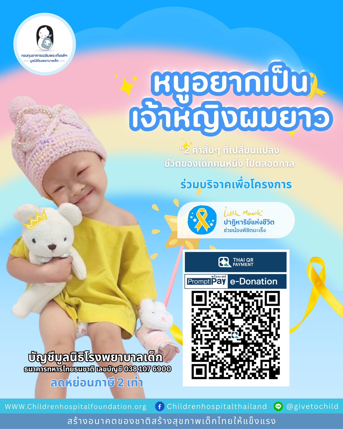มูลนิธิโรงพยาบาลเด็ก กองทุนอาคารเฉลิมพระเกียรติ ฯ ขอเชิญชวนผู้ใหญ่ใจดีร่วมสร้างปาฏิหาริย์ ช่วยน้องให้พิชิตมะเร็ง ผ่านการสนับสนุนโครงการ “Little Miracle ปาฏิหาริย์แห่งชีวิต ช่วยน้องพิชิตมะเร็ง” เพื่อสนับสนุนจัดสร้างหอผู้ป่วยปลูกถ่ายไขกระดูกและ สเต็มเซลล์ในเด็ก ได้ทางชื่อบัญชี มูลนิธิโรงพยาบาลเด็ก ธนาคารทหารไทยธนชาตTTB เลขบัญชี 0381076900 (ใบเสร็จลดหย่อนภาษี 2 เท่า) หรือบริจาคได้โดยตรงทางเว็บไซต์ www.childrenhospitalfoundation.org