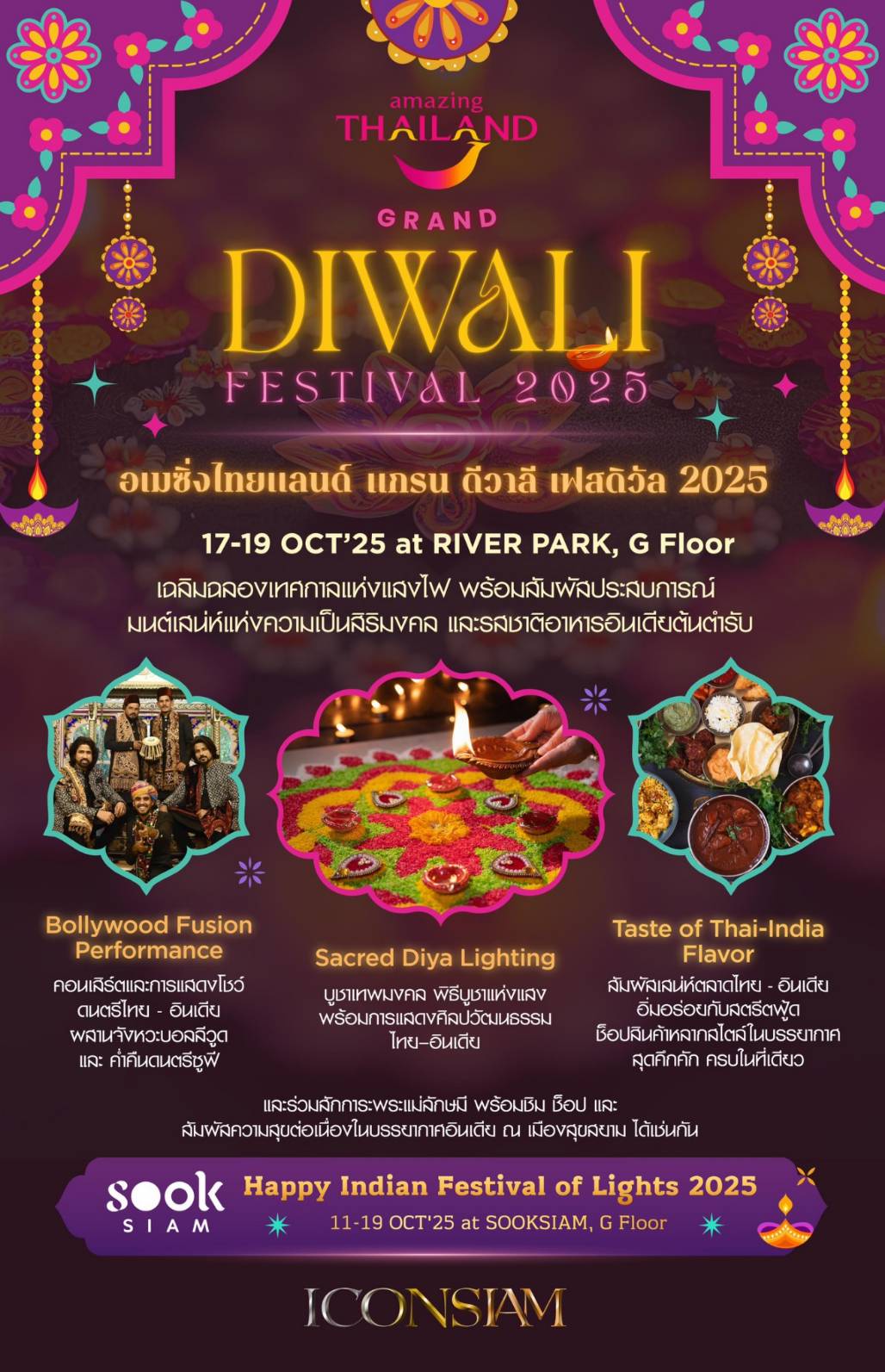 ไอคอนสยาม แลนด์มาร์กระดับโลกริมแม่น้ำเจ้าพระยา สร้างปรากฏการณ์ความประทับใจอีกครั้งกับความสำเร็จของงาน “AMAZING THAILAND GRAND DIWALI FESTIVAL 2025” เทศกาลแห่งแสงสว่างสุดยิ่งใหญ่ประจำปี โดยเป็นความร่วมมือระหว่าง สมาคมอินเดียแห่งประเทศไทย (Indian Association of Thailand: IAT), การท่องเที่ยวแห่งประเทศไทย (ททท.), กรุงเทพมหานคร, กระทรวงวัฒนธรรม, ภารตะช้อยส์ (Bharat Choice) และมิตรแท้ประกันภัย ที่ร่วมกันถ่ายทอดพลังแห่งศิลปะ วัฒนธรรม และมิตรภาพระหว่างไทย–อินเดีย ได้อย่างงดงามและทรงพลัง ซึ่งจัดขึ้นระหว่างวันที่ 17–19 ตุลาคม 2568 ณ ริเวอร์ พาร์ค ชั้น G ไอคอนสยาม โดยปีนี้ได้มีการจัดแสดงพลุดอกไม้ไฟเฉลิมฉลองเทศกาลดิวาลีอย่างตระการตาเหนือแม่น้ำเจ้าพระยาเป็นครั้งแรกในประเทศไทย