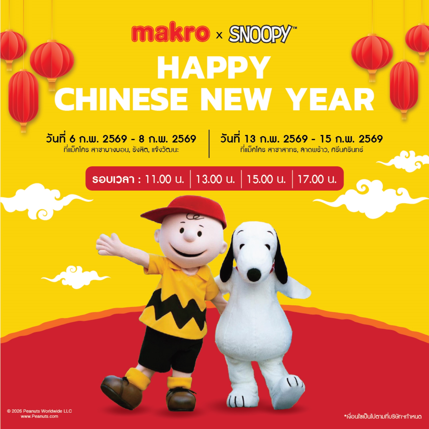 แม็คโคร จัดกิจกรรมต้อนรับตรุษจีนในบรรยากาศสนุกสนาน กับกิจกรรมธีม Snoopy ที่มาสร้ างรอยยิ้มและความสุขให้กับผู้ มาใช้บริการ วันที่ 6-8 ก.พ. 2569ที่แม็คโคร สาขาบางบอน, รังสิต และแจ้งวัฒนะ วันที่ 13-15 ก.พ. 2569ที่แม็คโคร สาขาสาทร, ลาดพร้าว และศรีนครินทร์ (รอบเวลา 11.00 น. / 13.00 น. / 15.00 น. / 17.00 น.)