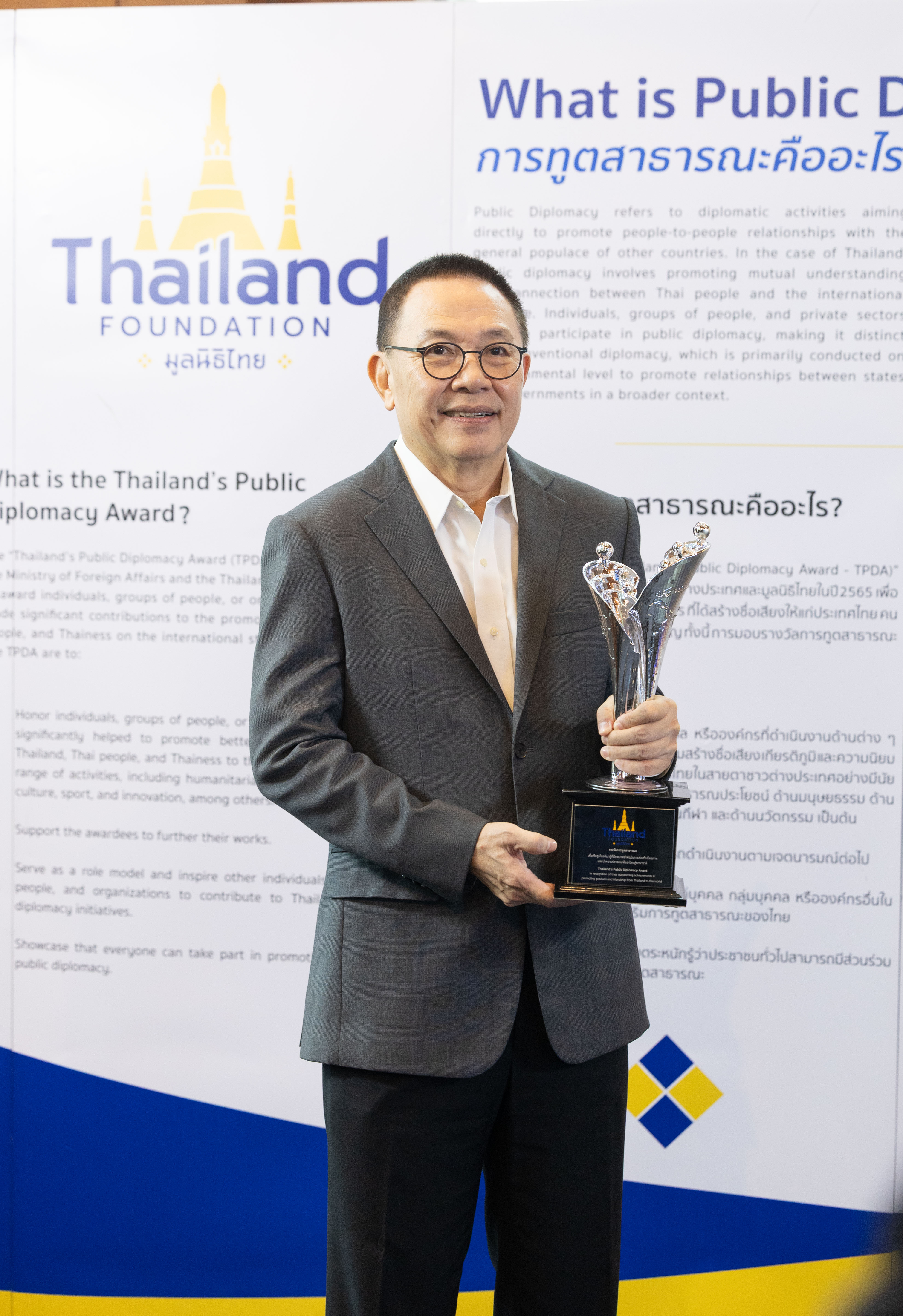 “การทูตในโลกปัจจุบันไม่ได้จำกัดอยู่เพียงความสัมพันธ์ระดับรัฐต่อรัฐอีกต่อไป แต่ประชาชนทุกภาคส่วนสามารถมีบทบาทเป็นนักการทูตสาธารณะได้ ผ่านการถ่ายทอดเรื่องราวดี ๆ ของประเทศไทยสู่สังคมโลก รางวัลนี้จึงไม่เพียงเป็นการยกย่องเชิดชูเกียรติผู้ทำคุณประโยชน์แก่ประเทศ แต่ยังเป็นแรงบันดาลใจให้สังคมตระหนักว่า ทุกคนสามารถมีส่วนร่วมในการขับเคลื่อนภาพลักษณ์ของไทย ให้เป็นที่รู้จักในระดับสากลได้”